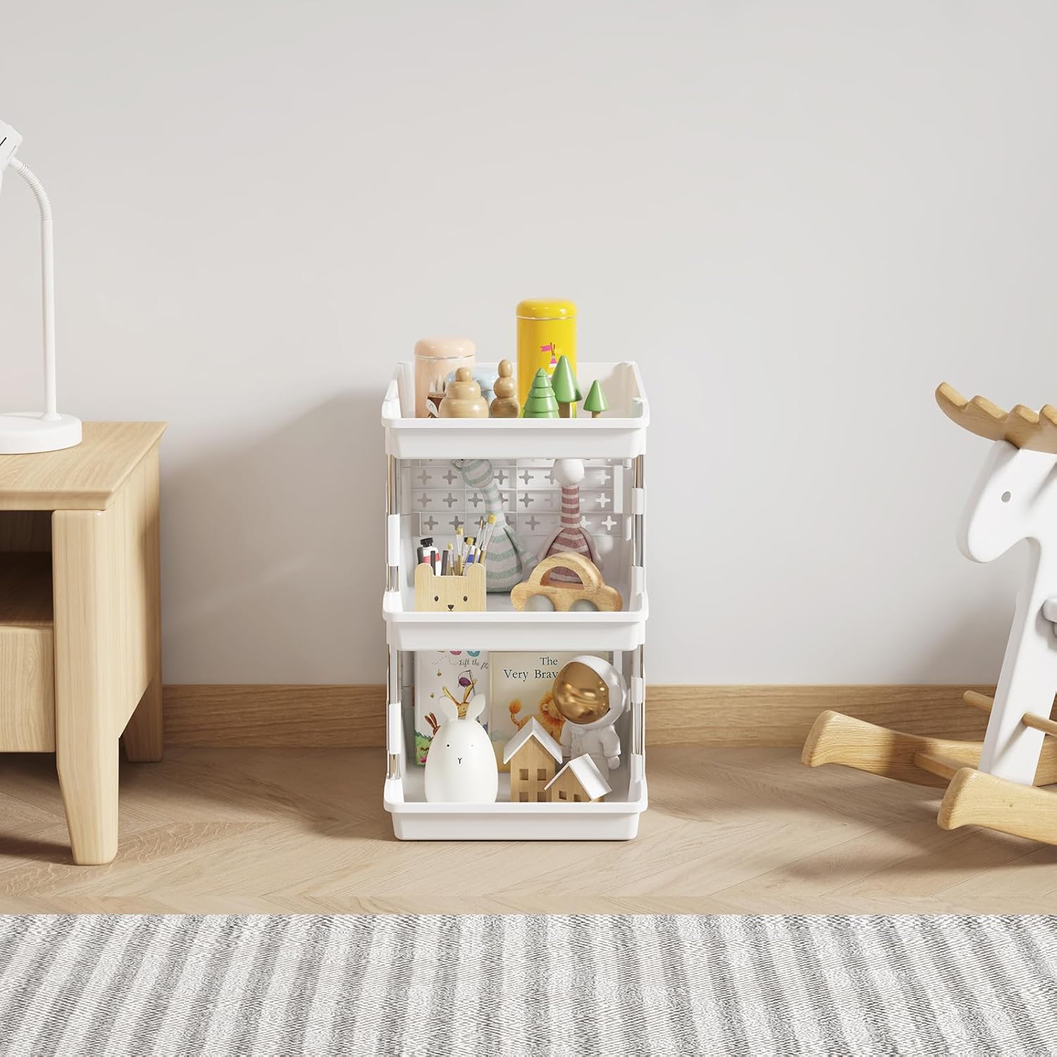 Stable and Sturdy: The storage bins for shelves are made of high-quality PP plastic and easy to clean with a damp cloth. The metal pole is made of waterproof and rust-proof stainless steel. These materials ensure durability and longevity, providing you with long-lasting storage solutions that can withstand daily wear and tear.