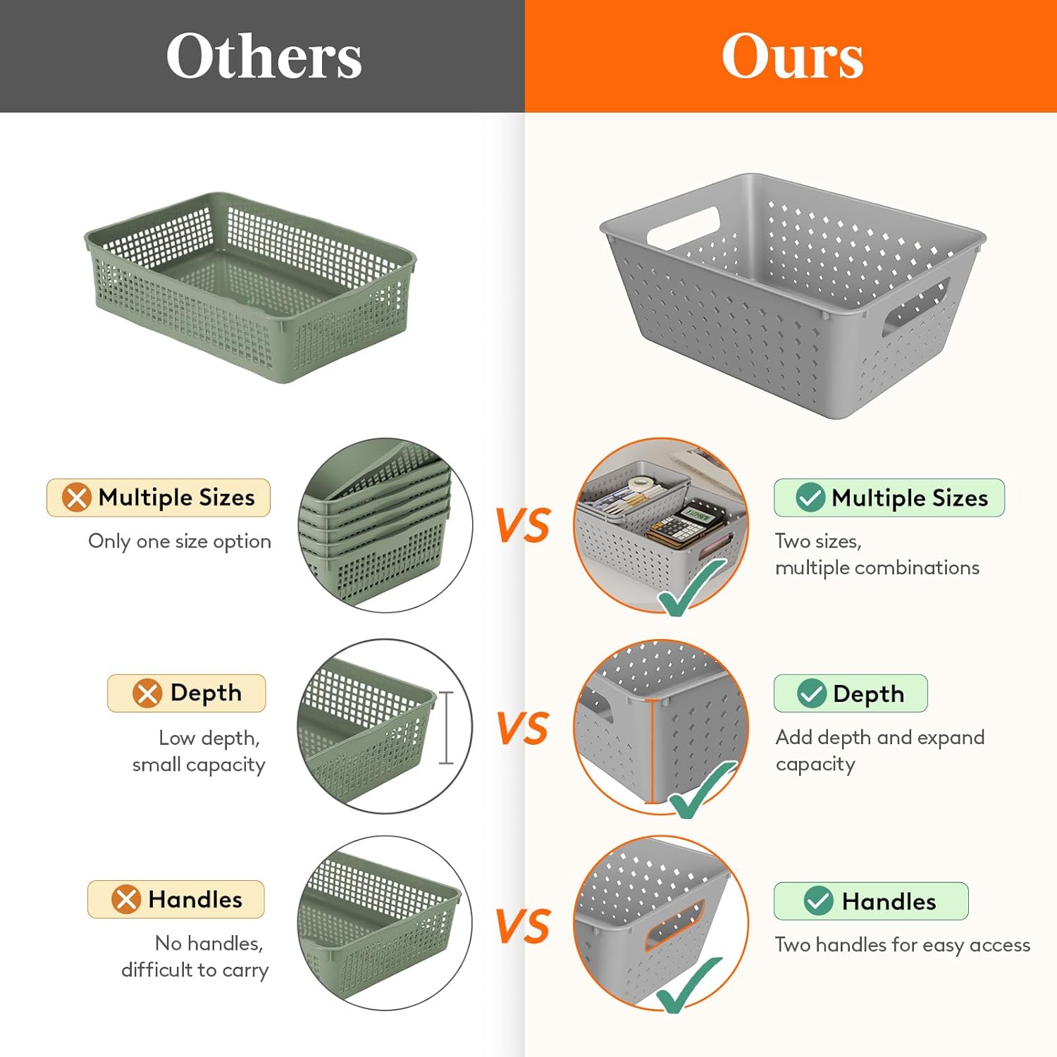 ● Multi-scenario Use:These versatile baskets are ideal for use in any room, including the kitchen, pantry, bedroom, bathroom, living room, classroom, or office.