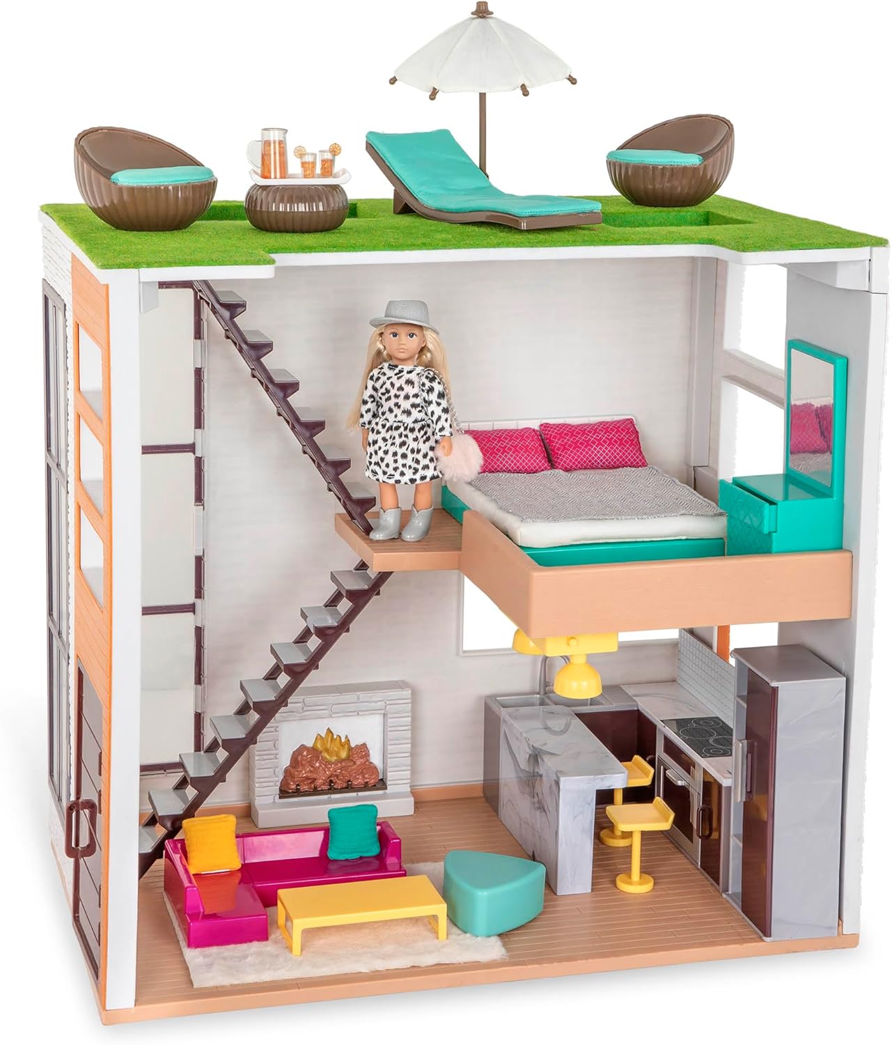 Trendy Loft: From the realistic brick and glass exterior, to 3 different play areas, this stylish and open-concept dollhouse is a great home for your trendy mini dolls!