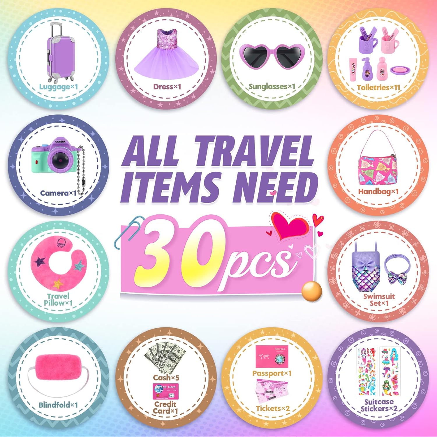 【30 PCS TRAVEL ACCESSORIES】 – Luucio 18 Inch Girl Doll Accessories include 1 x suitcase, 2 x Doll clothes, 1 x Doll handbag, 1 x sunglasses, 1 x camera, 11 x Toiletries, 2 x Suitcase Stickers, 1 x travel pillow, 1 x passport, 2 x air tickets, 5 x cash, 1 x blindfold, 1 x credit card. (NOTE: NOT INCLUDED DOLLS AND SHOES)