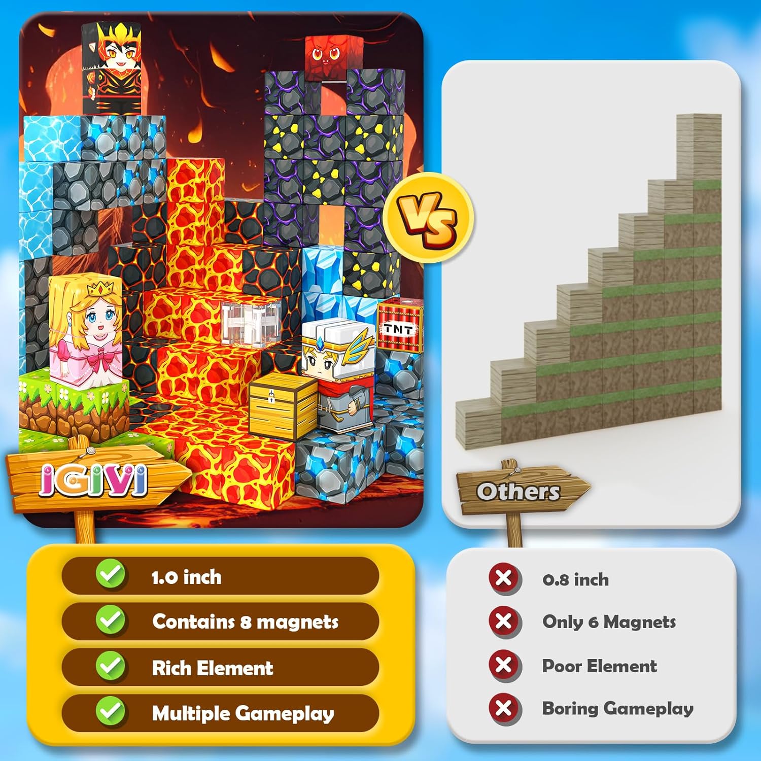 【Trustworthy Quality】 IGIVI magnetic cubes pay more attention to the quality and playability of toys, smooth edges, to avoid hurting the toddlers’s small hands. Each magnetic block contains 8 magnets, so that it can build a taller and stronger shape.