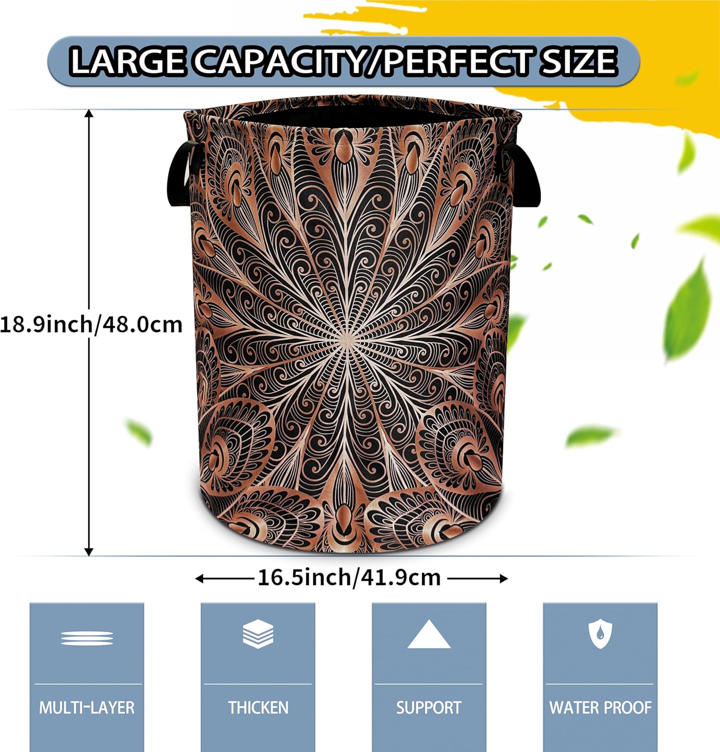 Dimensions of the laundry basket: 18.9 ” (height) x 16.5 ” (diameter) inches. There is enough space to store a lot of clothes and store various items.