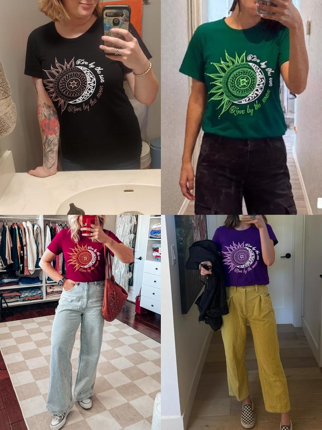 MaQiYa Womens Graphic T Shirts Summer Cute Cotton Moon and Sun Short Sleeve Casual Loose Tops