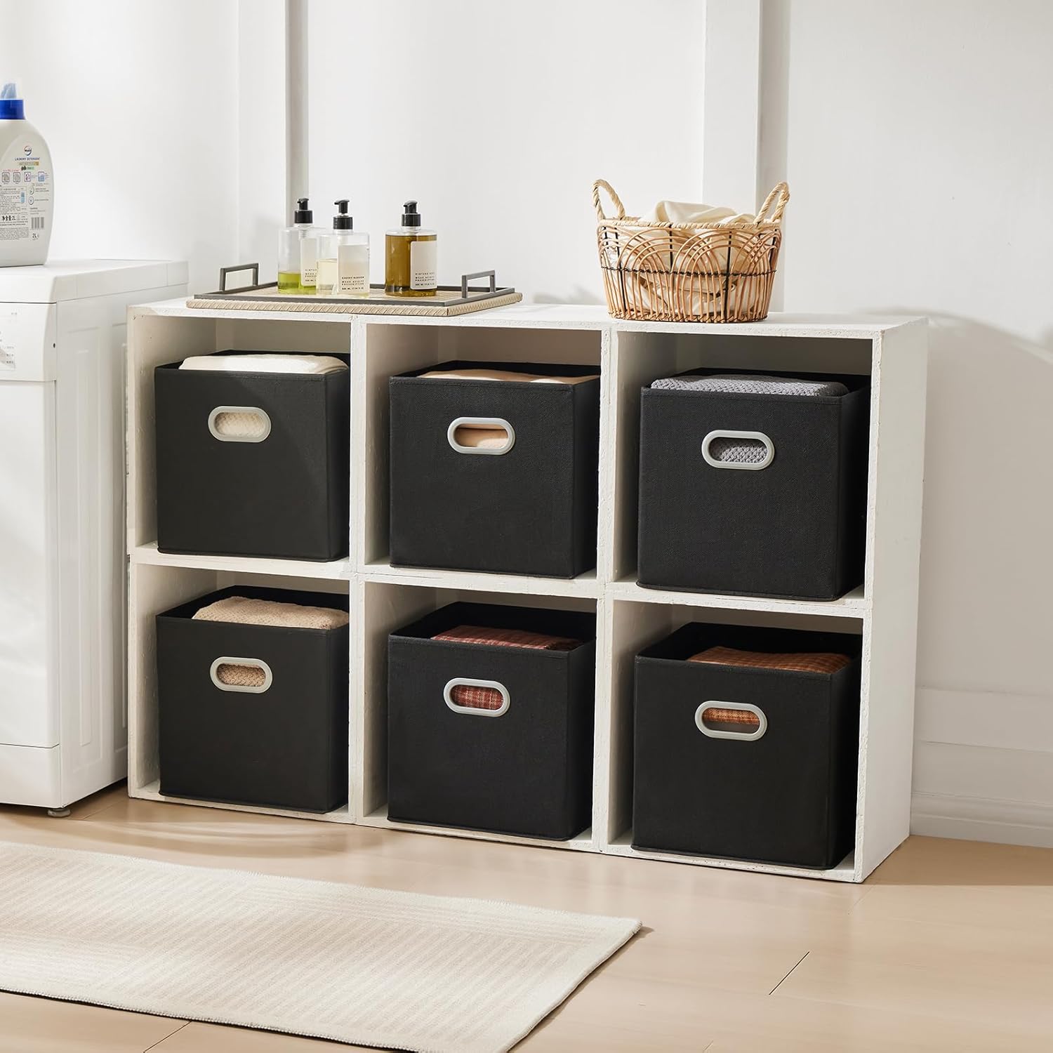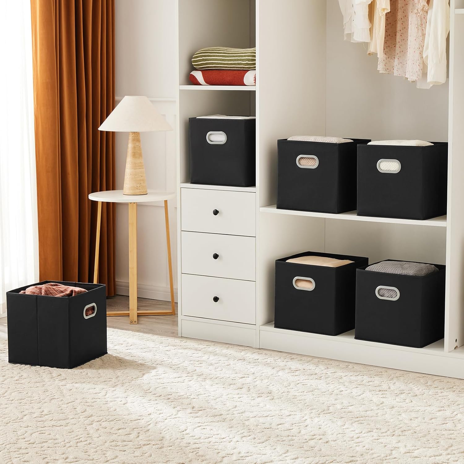 [CUBE STORAGE BINS WITH HANDLE]:Double side plastic handles, do not affect the storage function while facilitating stable movement of the storage box and protect your hands. Simplicity design with color black will beautify your closet and room.