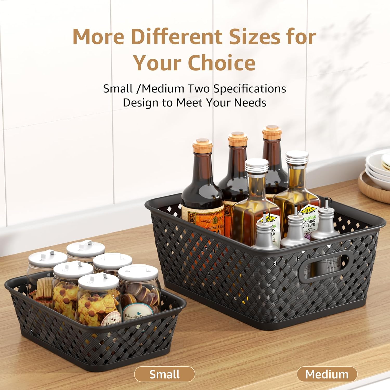 Perfect Size: There are two different sizes available, S and M. Perfect size to help you save space and keep your home organized. Different sizes of black baskets give you a variety of options for storing different things. You can choose the most suitable size according to your storage needs. Here is “small” – Mearsures 7.5 x 5.4 x 2.5 inches. Pack of 3.