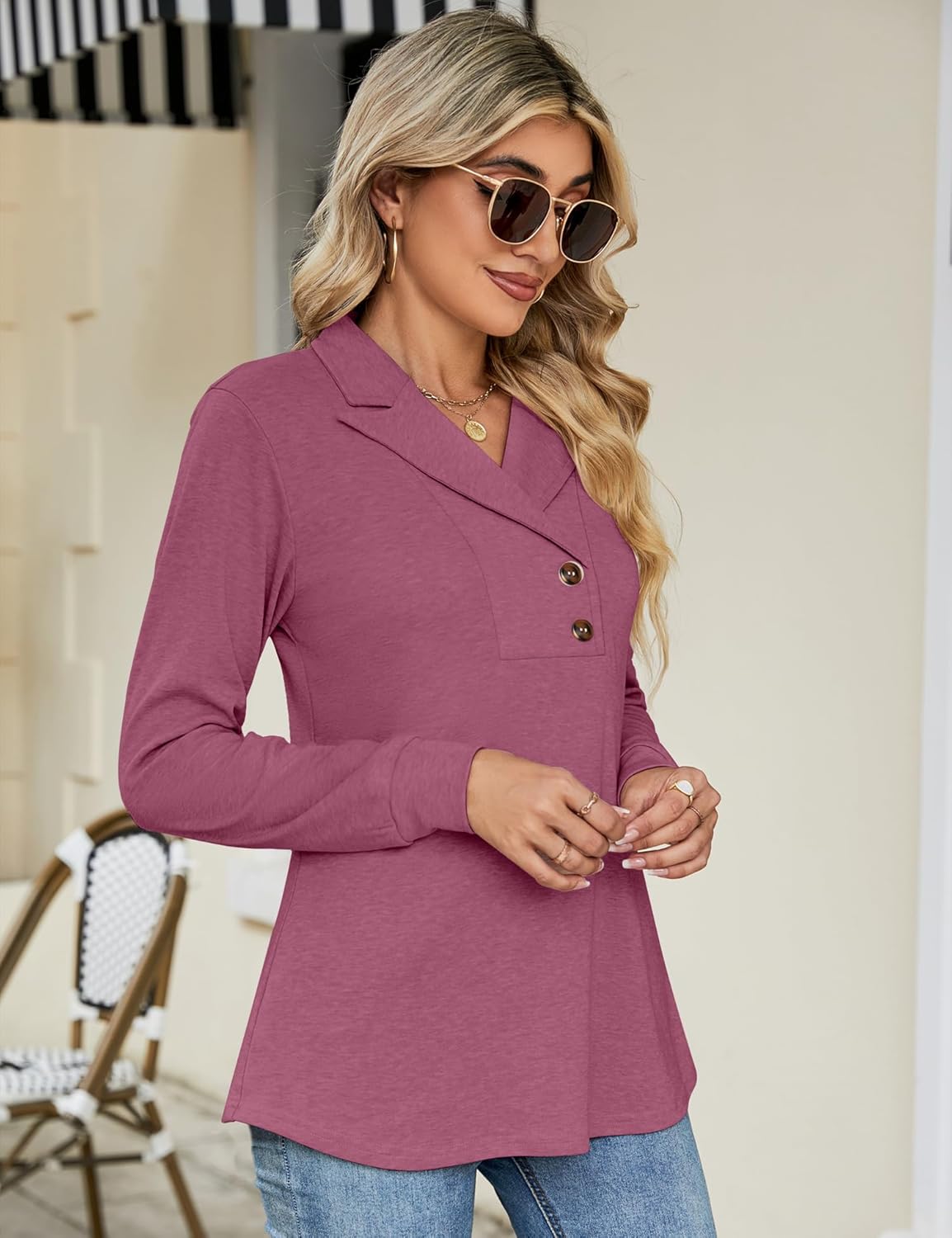 60% Polyester, 35% Rayon, 5% Spandex. The peak lapel pullover for women is made of super comfy and lightweight, breathable and stretchy fabric, which it’s very skin-friendly to use.
