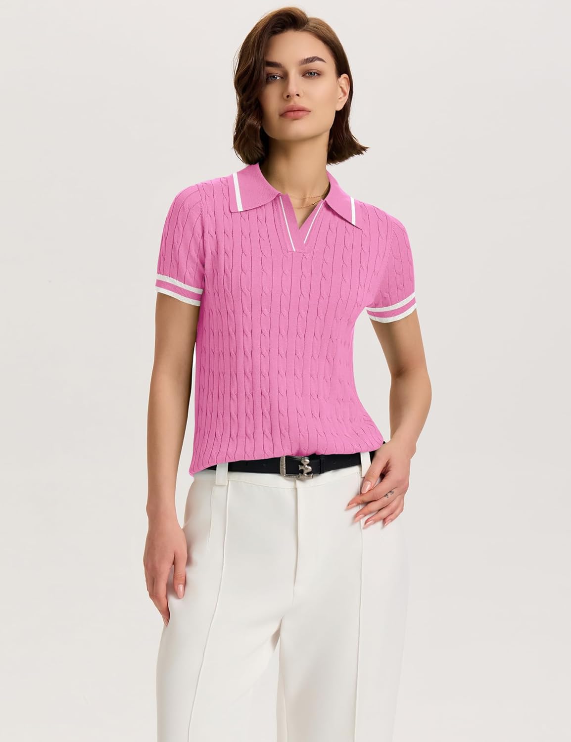 The video showcases the product in use.The video guides you through product setup.The video compares multiple products.The video shows the product being unpacked. pink sweaters Cute Shirts 2025 Color Block Merchant Video