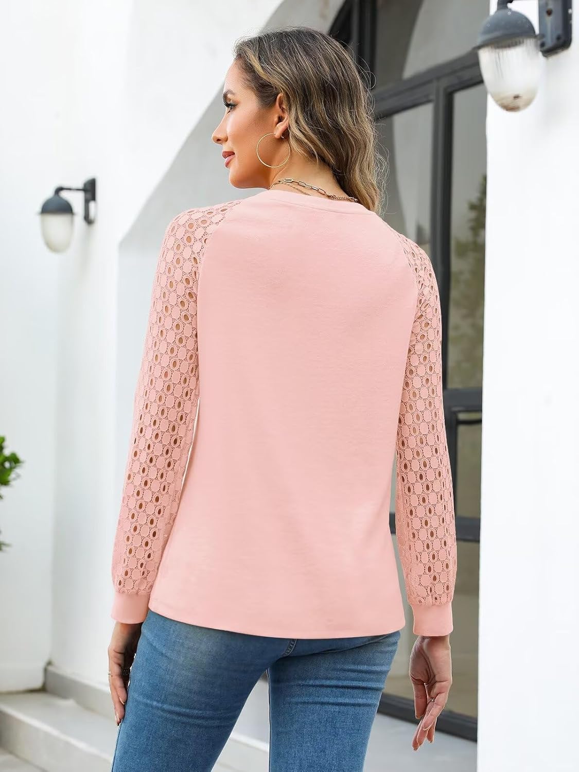 >Fabric: Polyester, Rayon and Spandex; Soft, stretchy, breathable and smooth fabric; It’s comfy to wear it all day.>Features: Lace Sleeve Tops, Henley Tops, Button Down Shirts, Long Sleeve Shirts, Women’s blouse. Long sleeve tops with lace design, provides a flattering and elegant look.