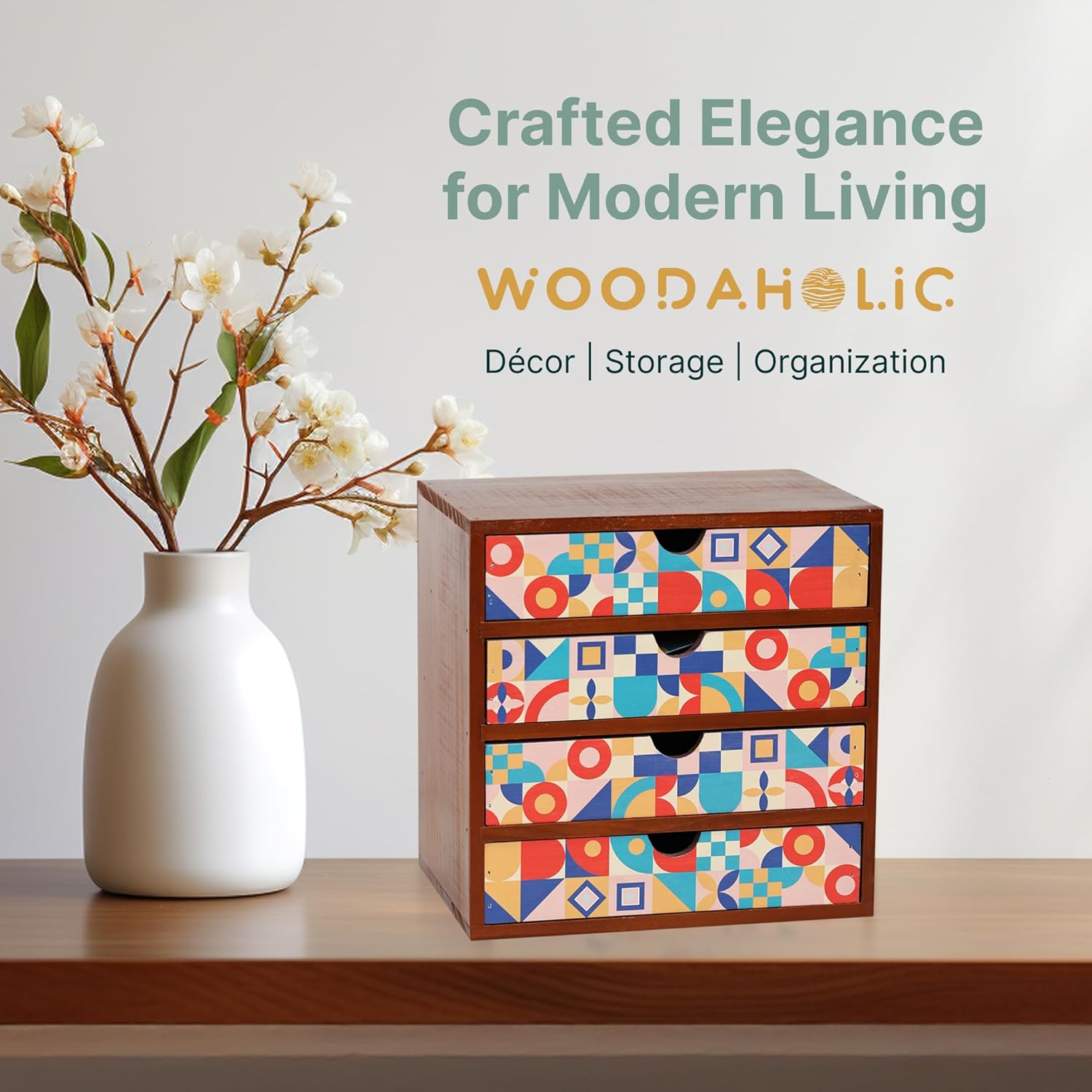 Bright interiors & non-slip base: The geometric pattern continues inside each drawer for a cohesive, polished look. Adhesive mounts ensure stability, preventing the organizer from sliding while protecting surfaces and maintaining its vibrant aesthetic.