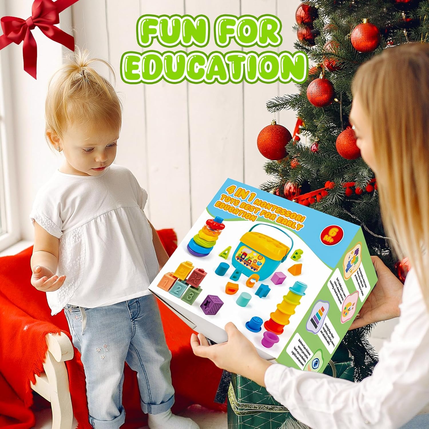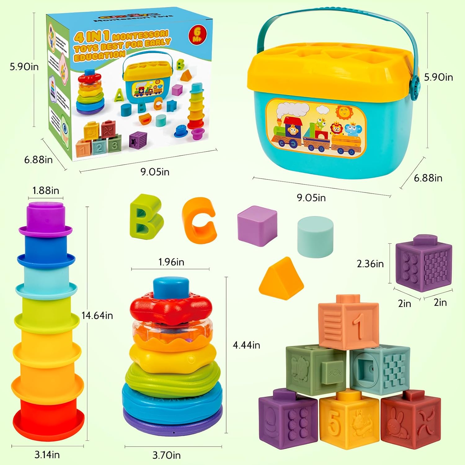 4 IN 1 MONTESSORI SENSORY TOY SET: Our 28 individual pieces for babies 6-12-18 Month and up baby toys come with 9 PCS sensory sorter shape matching toy set, 6 different colored building blocks, 7 PCS rainbow-colored stacking cups, 6 stacking rings, the perfect bundle for countless hours of fun!