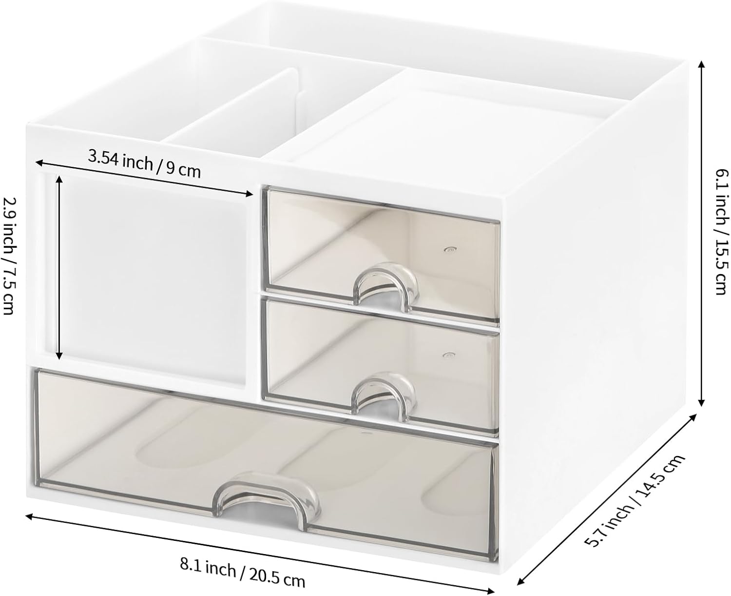 Color: WhiteMaterial: PlasticSize 8.1″L x 5.7″W x 6.1″HUsage: Desktop organizer with drawer for office, school, stationary, makeup organizer, bathroom storage organizer, keep your desk neat and clean, hold your small tools, papers and other supplies, it’s also great for makeup organizer to store makeup brushes, nail polishes, liquid foundation,easy to access your small items