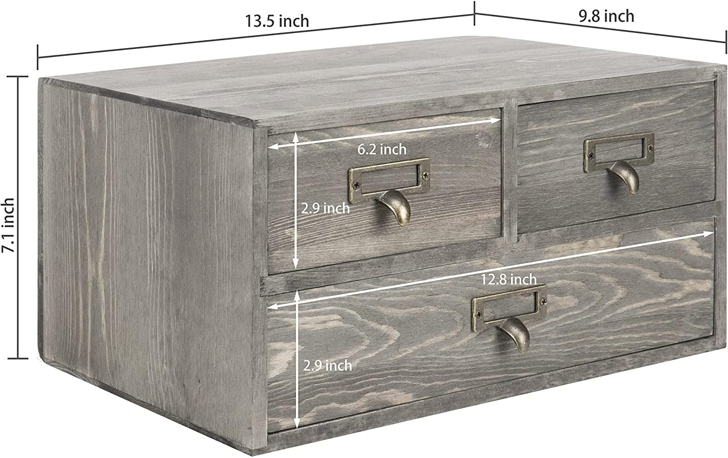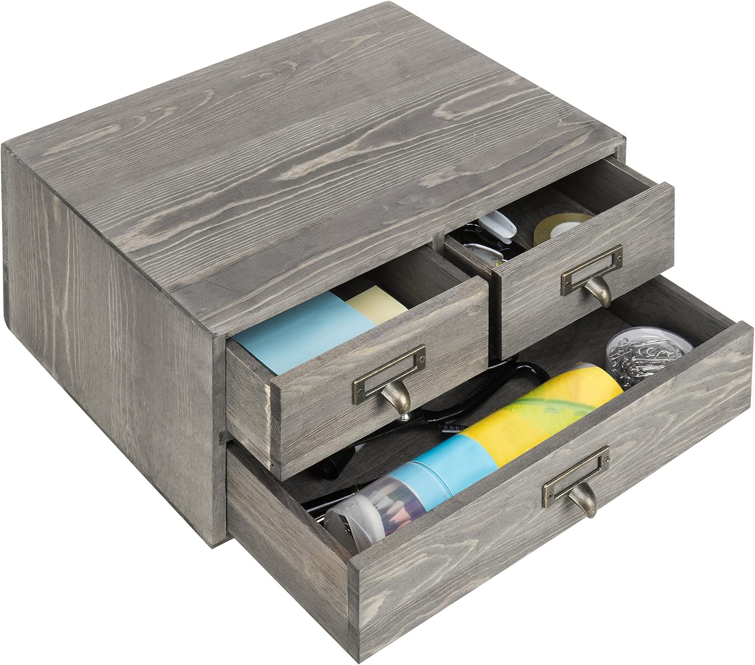 3-drawer wooden desktop organizer with vintage gray finish and antique-style drawer pulls