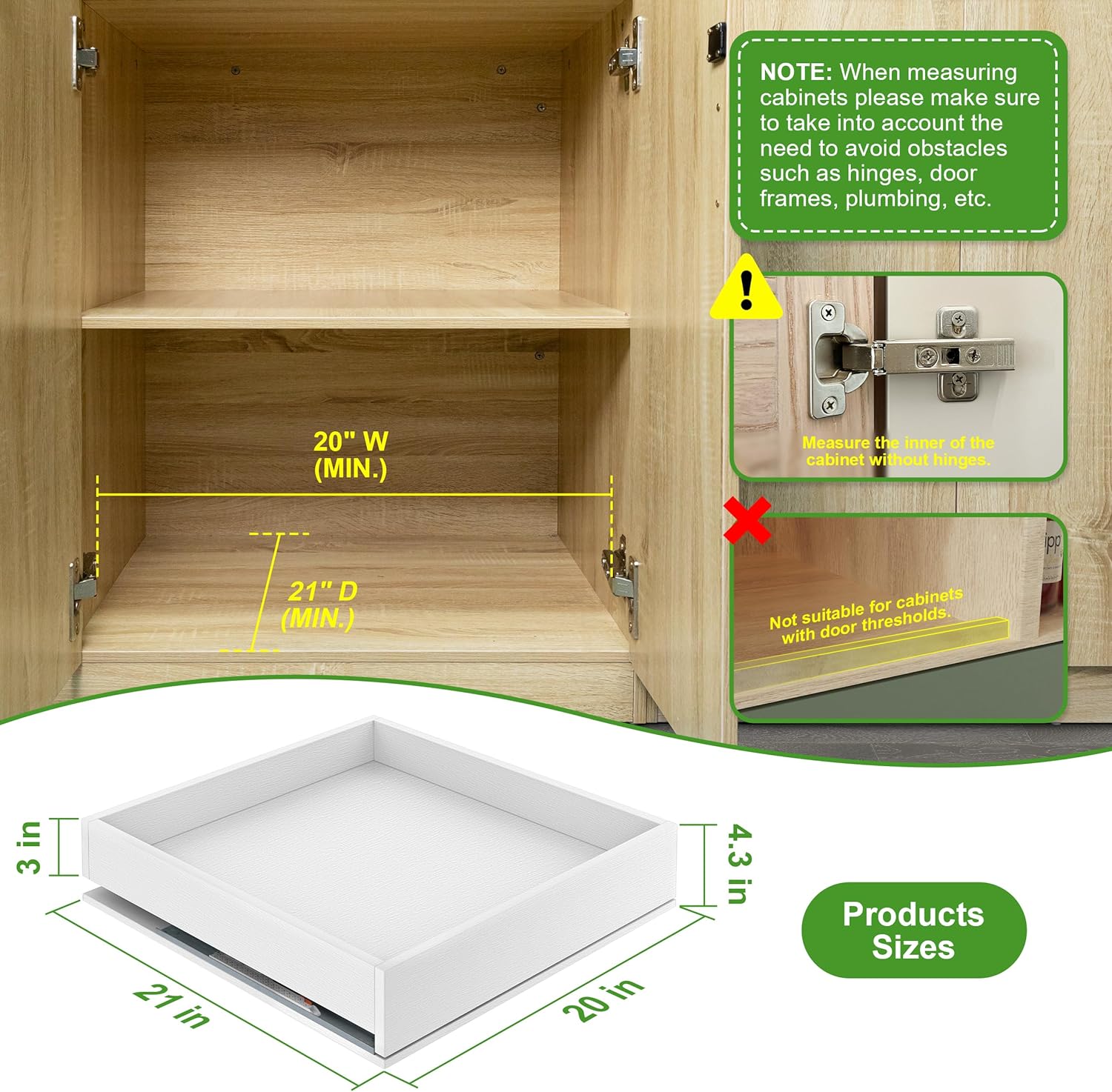 Measuring And Selection: Pull out cabinet drawer overall size is 20″W x 21″D x 4.3″H. Minimum cabinet inner width (inner width must be measured from the hinges) at least 20.5″W. Note: Measure cabinet interiors, including doors, hinges, frames, and plumbing