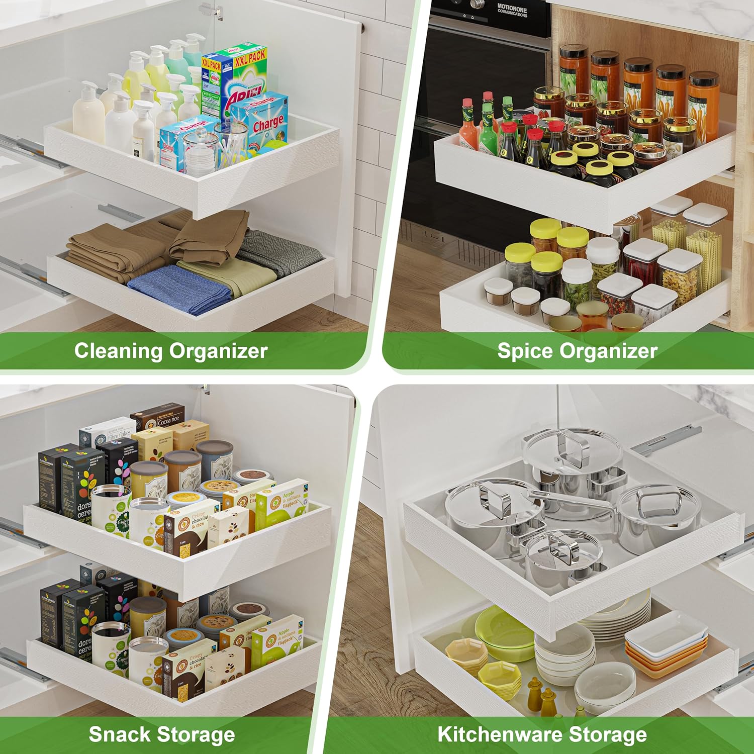 Optimized Kitchen Space & DIY Cabinets: Declutter and access storage easily with this pull-out drawer. Pull out drawer organizer for cabinets provides a clear storage view for easy access to kitchenware, spices, canned goods, Snack and cleaning products