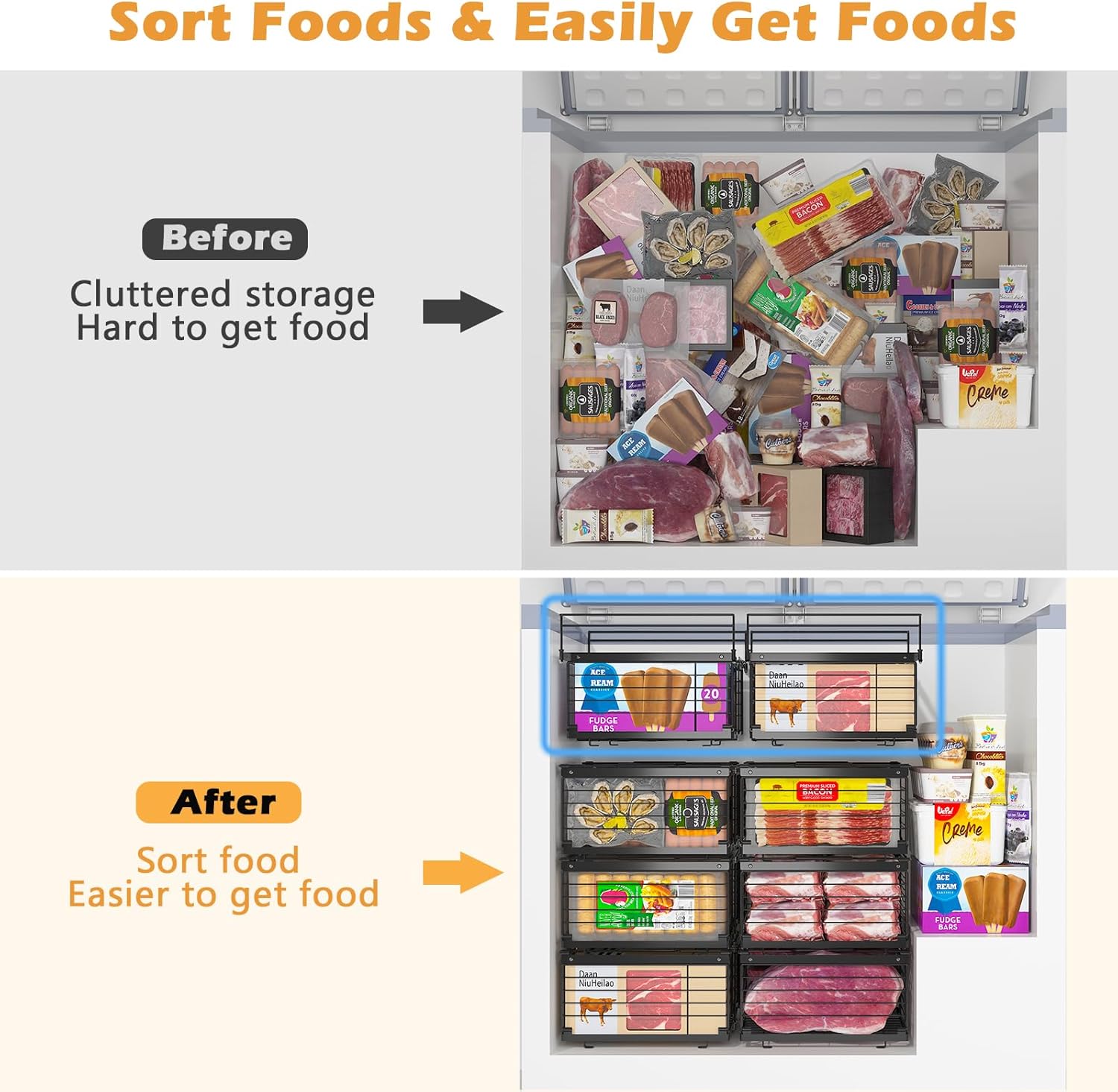Hanging Baskets for Easy Access: This set comes with 2 hanging baskets for optimizing space utilization of chest freezer. They prevent smaller or frequently used frozen food from piling up at the bottom, reducing search time and minimizing food waste due to forgotten or expired items.