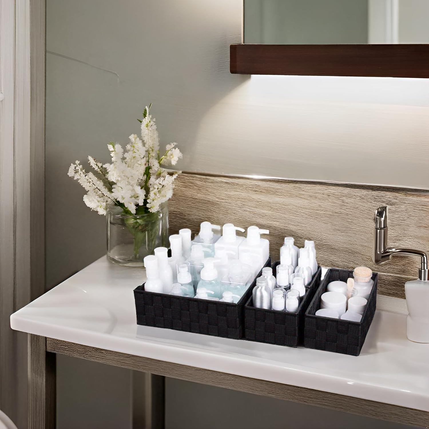 Package includes 4 pack different size woven storage boxes, 1 large size: 11″ x 11″ x 4.1″(L×W×H), 1 medium size: 10.2″ x 5.1″ x 3.7(L×W×H), 2 small size: 5.1″ x 5.1″ x 3.7″(L×W×H), washable.