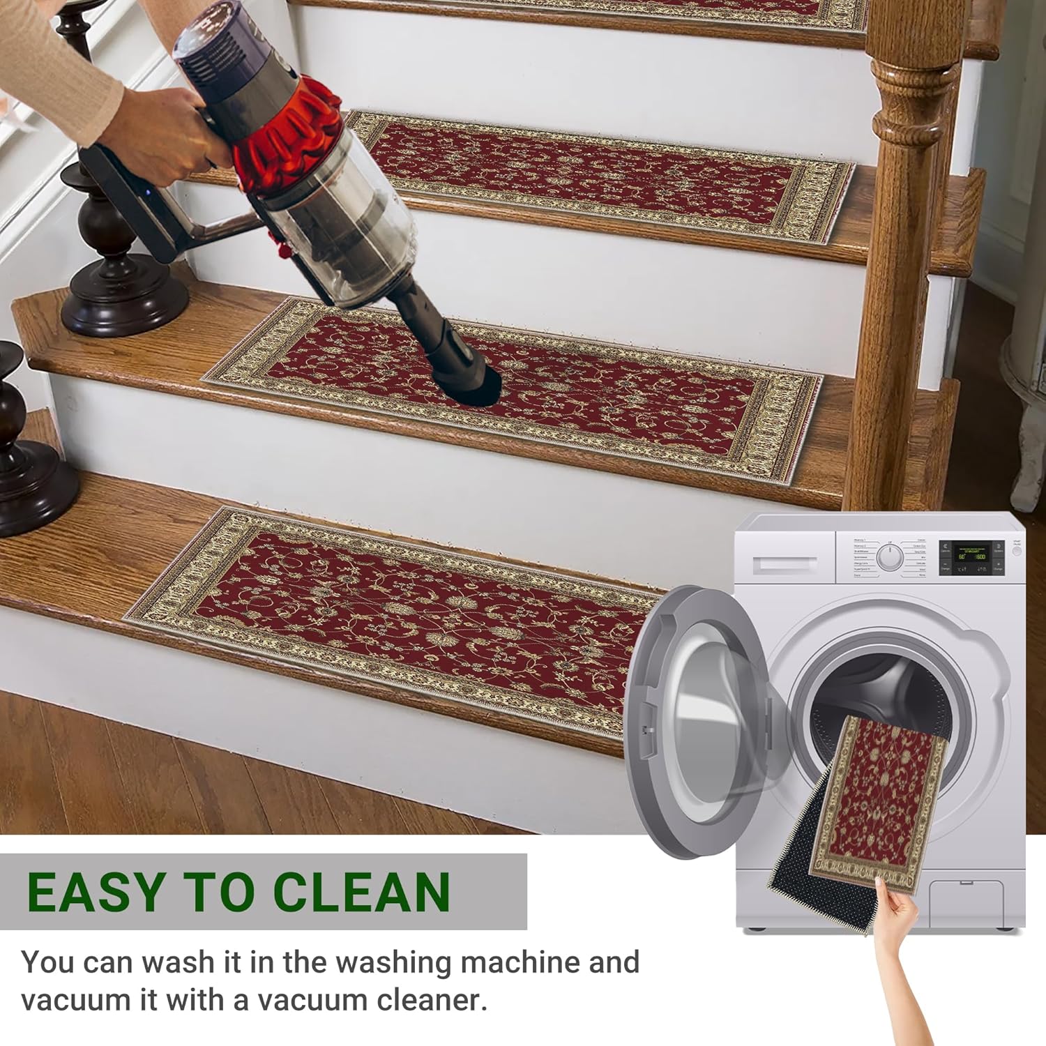 MACHINE WASHABLE & EASY TO CLEAN: Our stair treads are not just about safety and comfort; they are also about ease of maintenance. They are machine washable and easy to clean, offering the convenience of hassle-free upkeep. Simply toss them in your washing machine, and they’ll come out looking as good as new. You can enjoy the benefits of a clean and secure staircase without the burdensome chore of complicated cleaning.