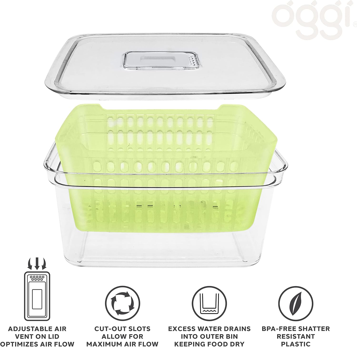 Stop wasting money on food that goes bad before you have time to use it! OGGI’s Store Fresh Veggie Bin is the ultimate produce saver and storage bin for fridge organization. The removable basket acts like a strainer and allows excess water to drain into the outer bin keeping food dry. Designed with adjustable air vents on the lid and slots in the inner basket maximum airflow in and around the container to help extend the life of your fruits and veggies. The plastic storage bin is made from durable BPA and chlorine-free shatter-resistant plastic. To maintain the highest quality of food storage possible it is recommended to hand wash. Refrigerator organization has never been easier! Save time and reduce clutter using these clear fridge storage bins. Prepare fruit and vegetables in advance and store while maintaining freshness. The Store Fresh collection offers three different sizes of bins to fit a variety of fresh foods like lettuce, carrots, peppers, strawberries, and melons. The sizes include 8.25˝ x 6˝ x 4˝, 8.25˝ x 6˝ x 4˝, and 12.25˝ x 8˝ x 6˝. Hand wash only.