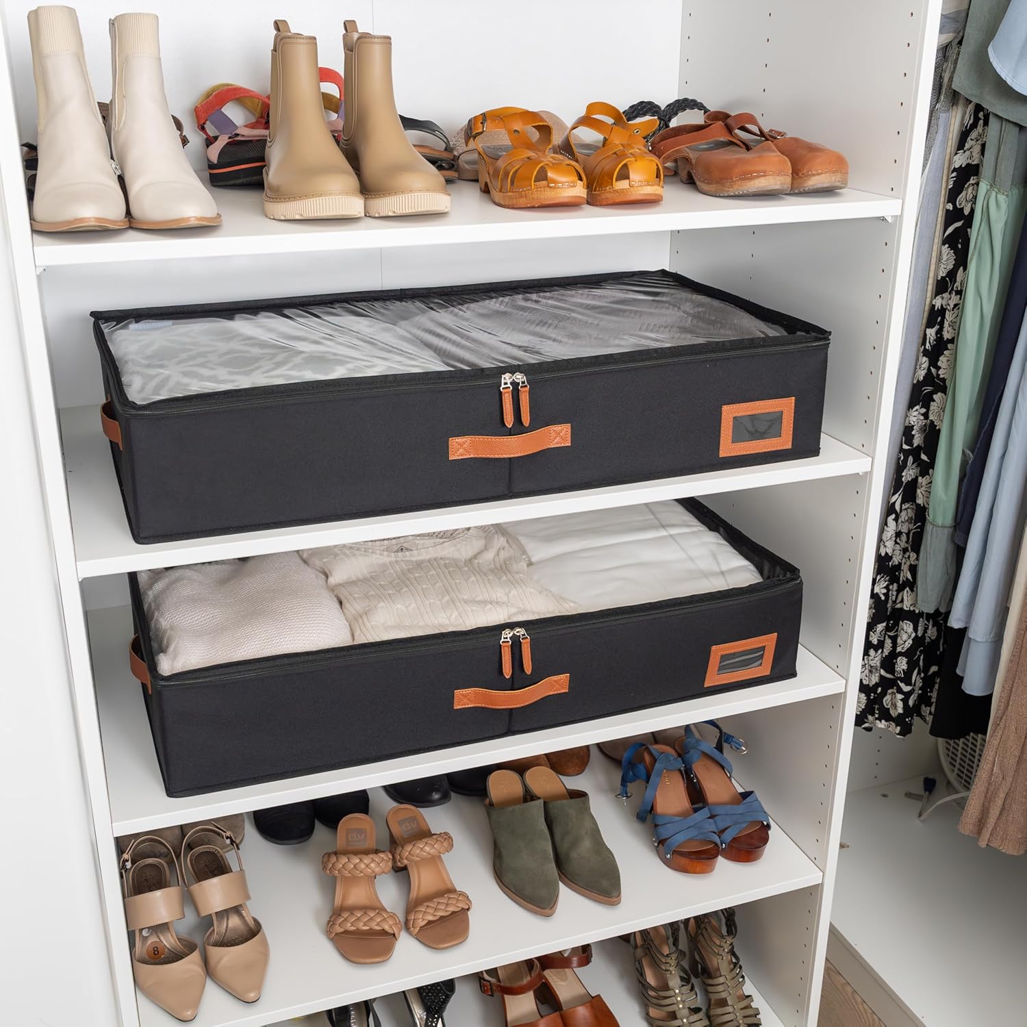 Clear PVC Lid with Label Pockets: The transparent PVC cover allows for quick content identification, eliminating the need to open the underbed storage containers. Additionally, two large label pockets provide extra organization, making these under bed organizers ideal for sorting clothes, shoes, and accessories.
