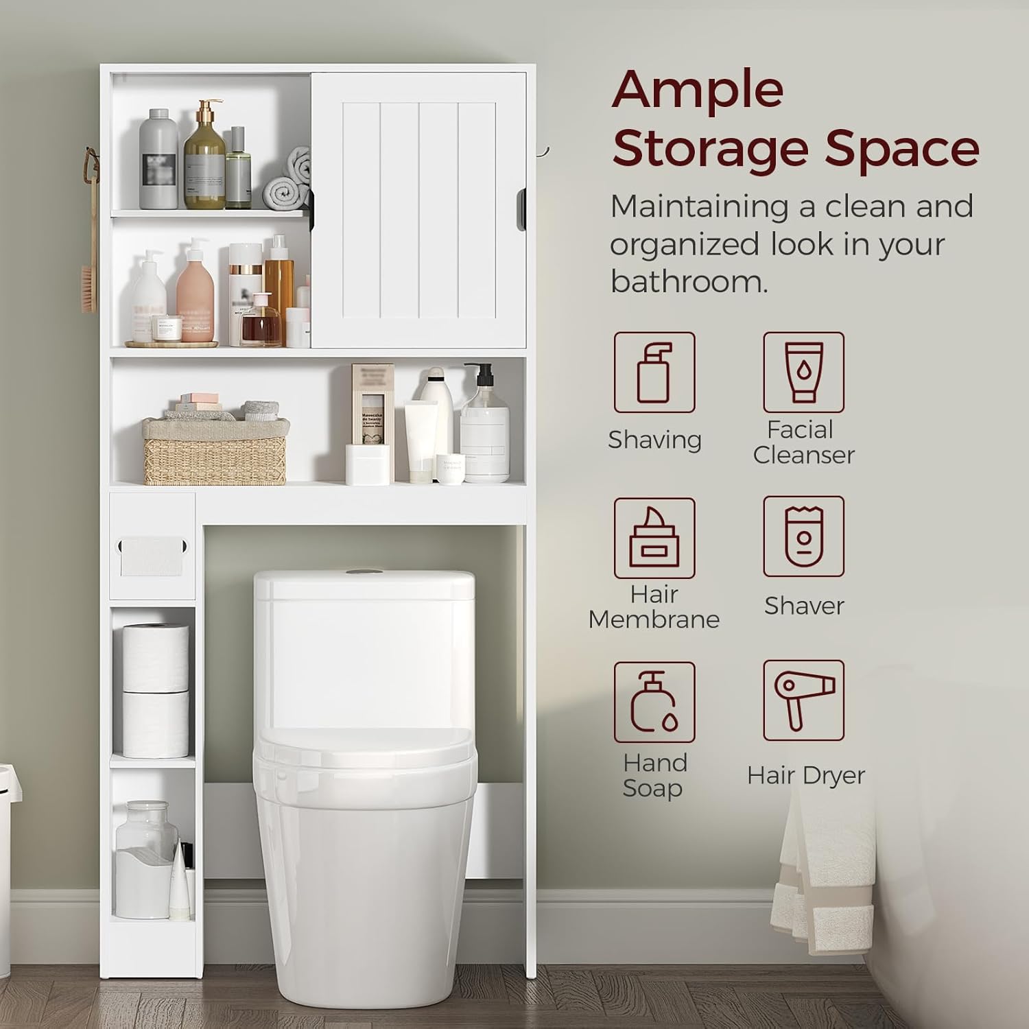 Versatile and Unique Design: This over-the-toilet storage cabinet features sliding doors for easy access to essentials. This toilet stand includes open shelves and a vertical cabinet for toilet paper, maximizing space and keeping your bathroom organized and tidy