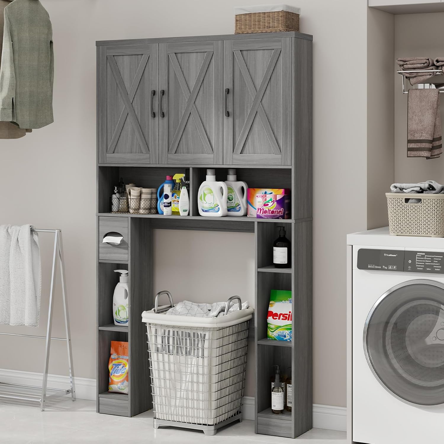 Over The Toilet Storage Cabinet, Farmhouse Toilet Cabinet Rack with 3 Barn Doors, Space Saving Bathroom Organizer with Shelves, Toilet Paper Holder and Towel Rack for Bathroom,Restroom,Laundry