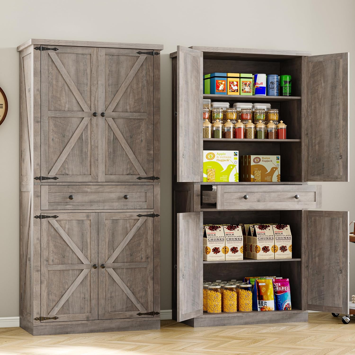 Effortless Accessibility and Durability: Designed for convenience, BORNOON kitchen pantry cabinet’s height and smooth-gliding drawers allow easy access to stored items. The barn doors add a rustic touch while remaining fixed for secure storage. The drawers glide smoothly on metal tracks, ideal for pantry staples or snacks. Customize the interior with adjustable shelves to meet all your storage needs, ensuring a clutter-free pantry.
