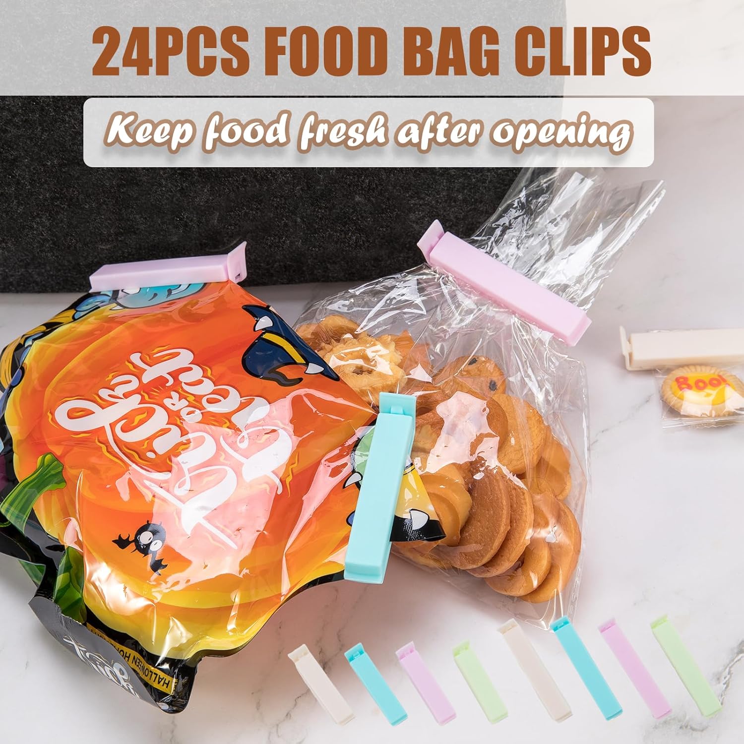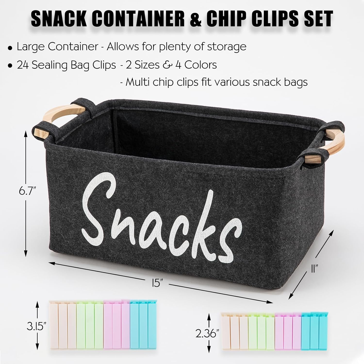 【 Premium Quality 】The pantry snack bin is made of thick felt which can keep its shape without support even when empty; package comes with 24 pieces colorful clips for chip bags to keep food fresh, a great combination for your snacks organization