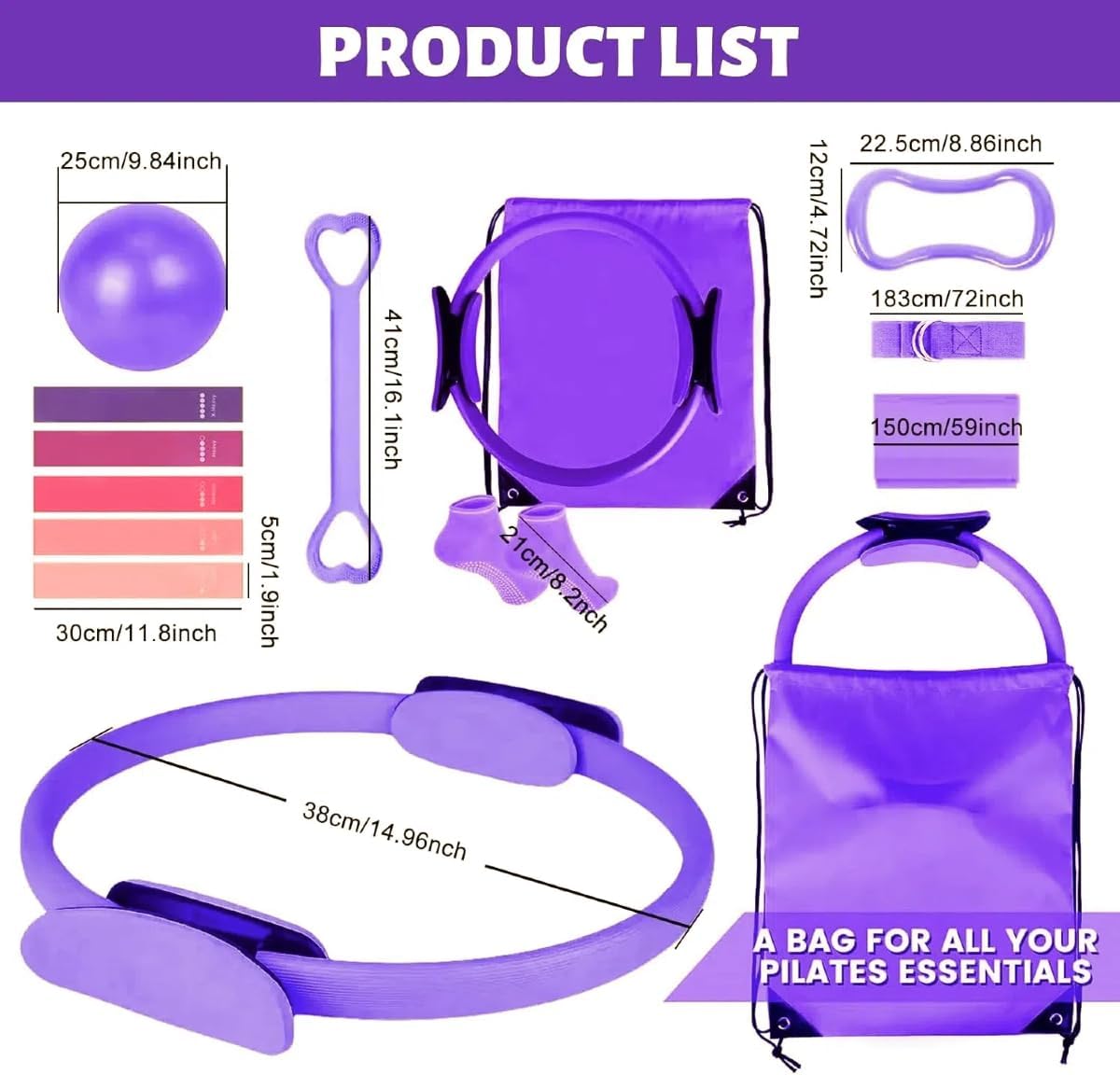 Pilates ring Circle Set:Our purple Pilates set is made of high-quality materials and contains 13 pieces of practical training equipment, providing you with comprehensive support for building a solid fitness foundation or further improving your Pilates level. Compact and portable, the set fits easily into a backpack or carry-on luggage, so you can enjoy Pilates on the go. Whether you are at home or traveling, this set is ideal for you