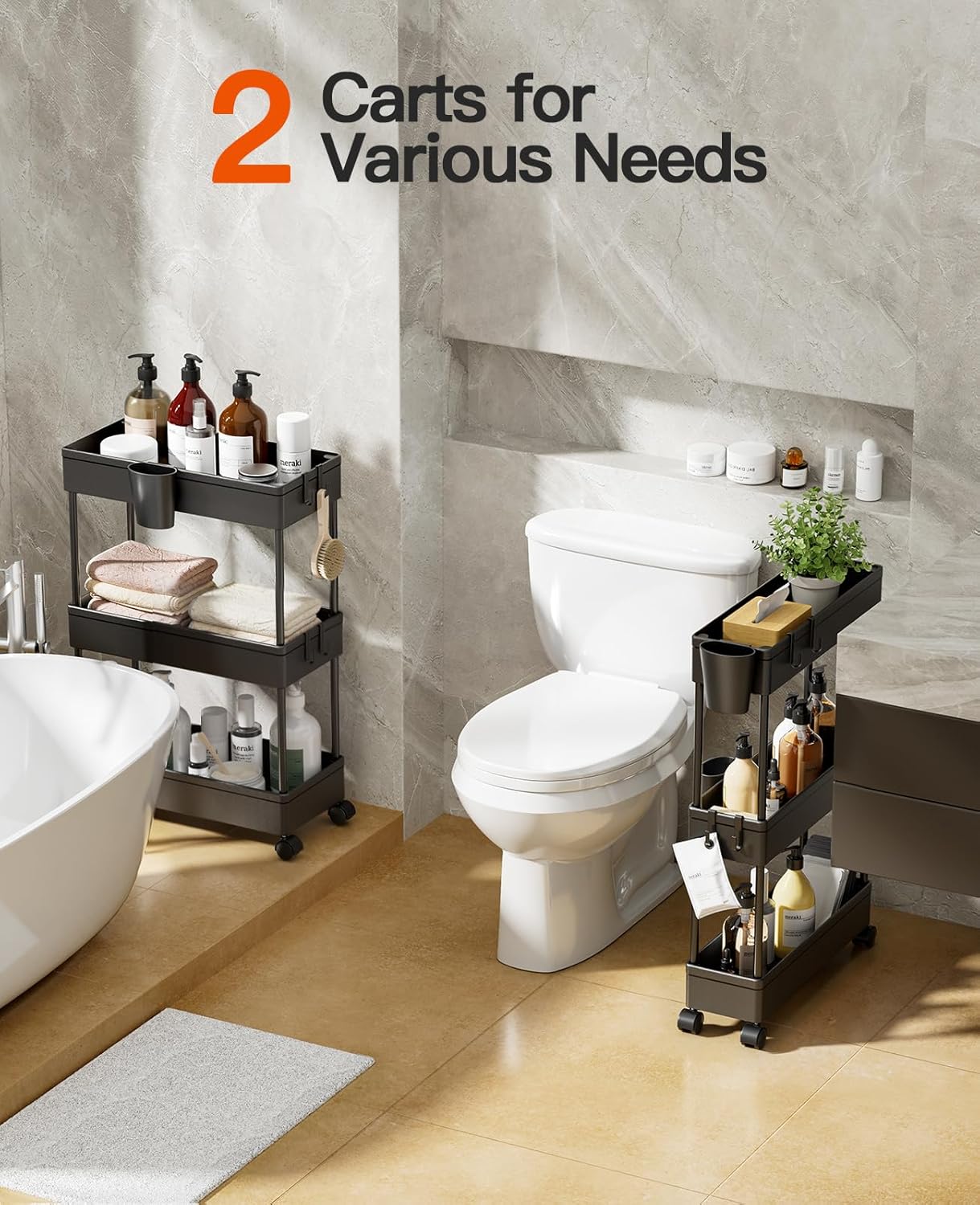 2 Carts for Flexibility: The bathroom cart set includes a wide and slim storage cart to provide storage solutions for small and larger spaces. The 6.9” bathroom cart holds larger items including toiletries and cleaning supplies, while the 5.2” slim storage cart bathroom cart fits in gaps between your toilet, sink, washer, or dryer.