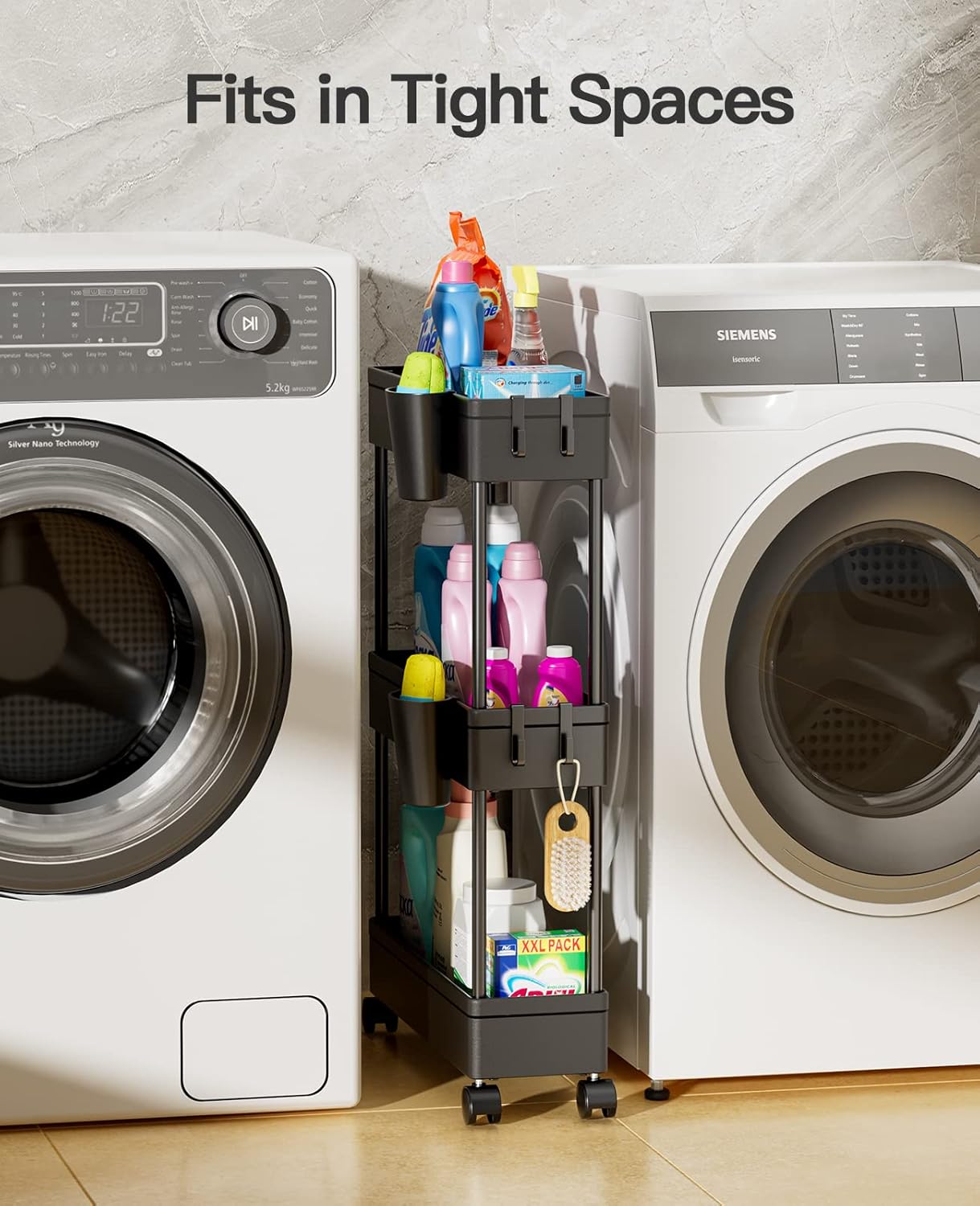 Plenty of Storage Space: With 3 storage baskets, the bathroom cart can hold everything from skincare products, cleaning supplies, laundry detergent, food, books, and more. 4 hanging cups and 8 hooks offer extra storage, making these rolling carts bathroom carts perfect for the bathroom, laundry room, kitchen, bedroom, and more.