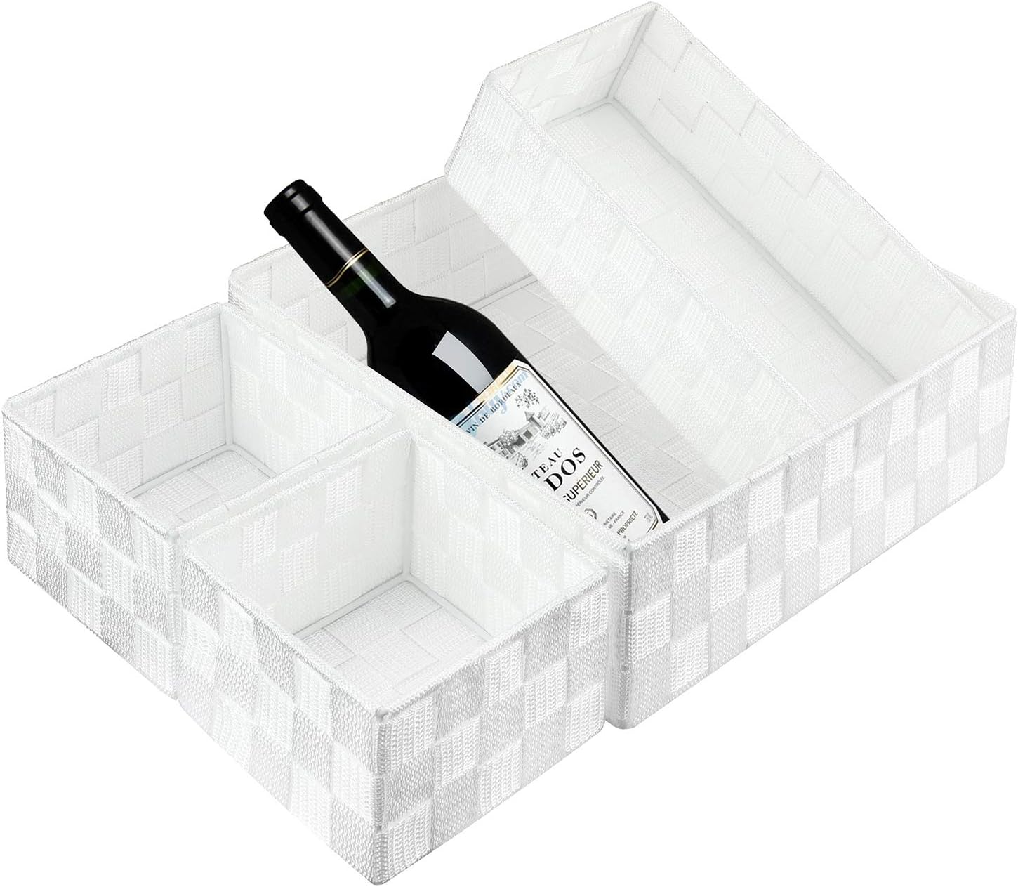 A set of 4PCS: The woven basket includes 1 large and 3 small organizer boxes that are perfect in the drawer. Measure about(L×W×H):11×11×3.9inches,10×5×3.7inches,5×5×3.7inches