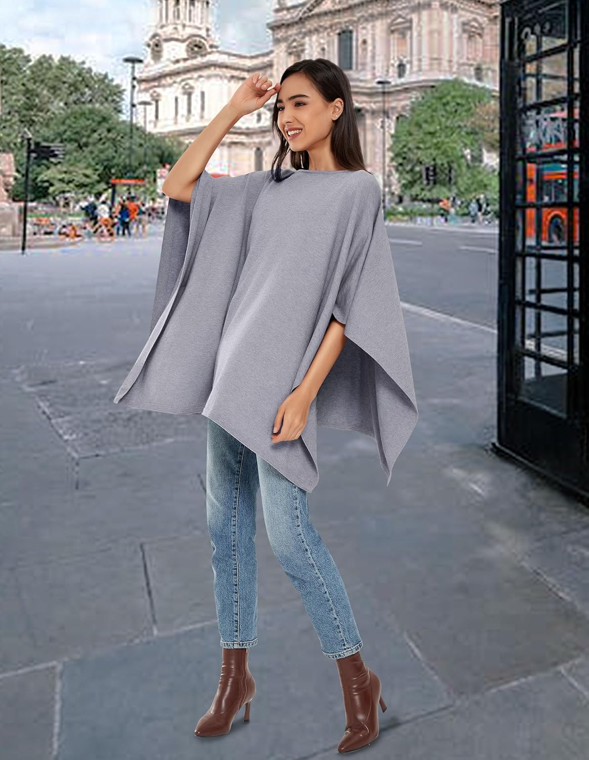 Customers find the poncho soft and appreciate its amazing texture, with one noting it feels like cashmere. The color receives positive feedback, with one customer describing how it drapes beautifully, and they like its weight and warmth, keeping them comfortable in chilly spring air. The material quality is decent, though opinions about the fabric thickness are mixed, with some finding it nice while others describe it as very thin. Customers disagree on the sizing, with some finding the length perfect while others say it’s too oversized.