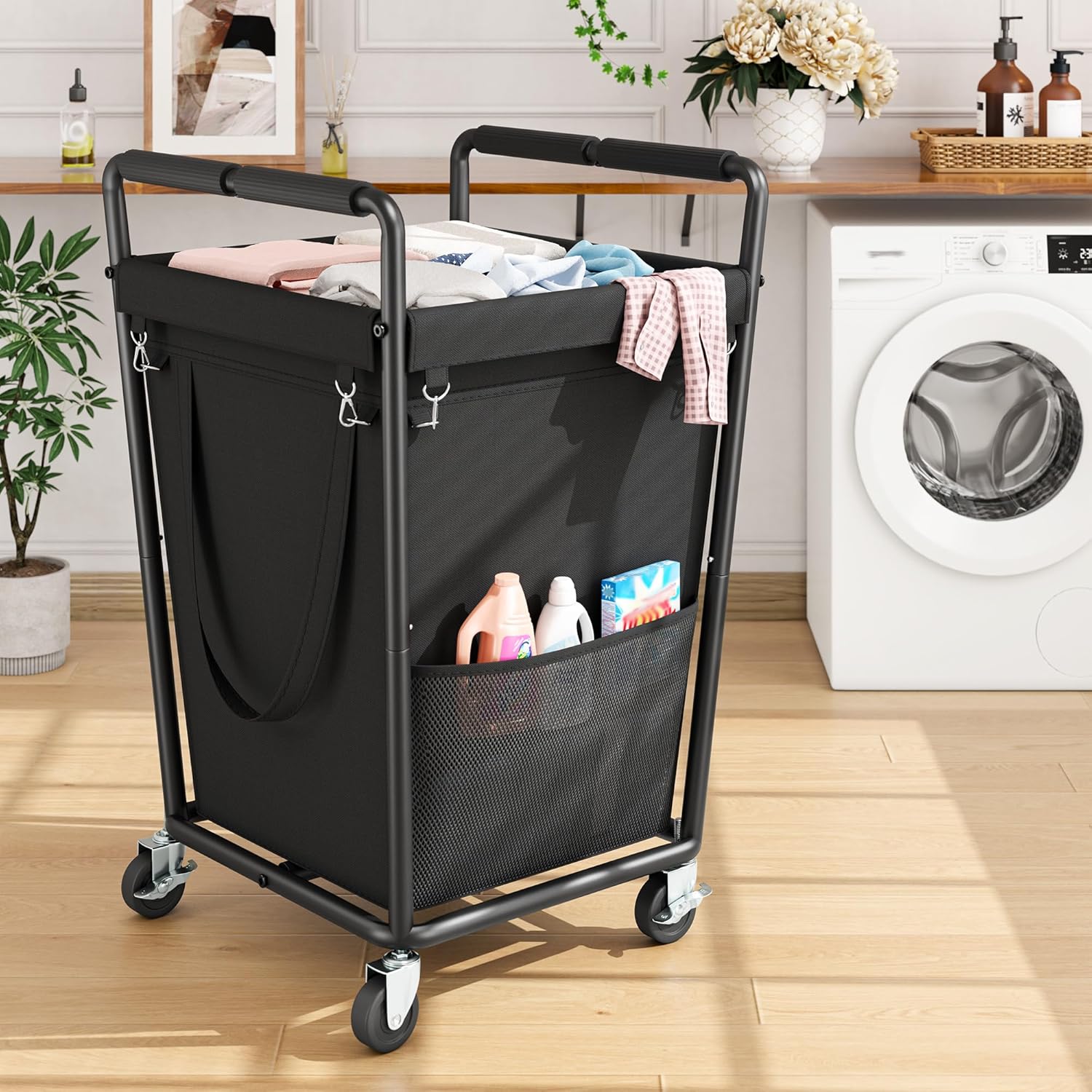Raybee Laundry Basket with Wheels & Handles, 180L Laundry Cart with Removable Bag & Metal Frame for Clothes Storage, Laundry Room Organization Rolling Hamper with Wheels For Laundry, Dorm (Black)