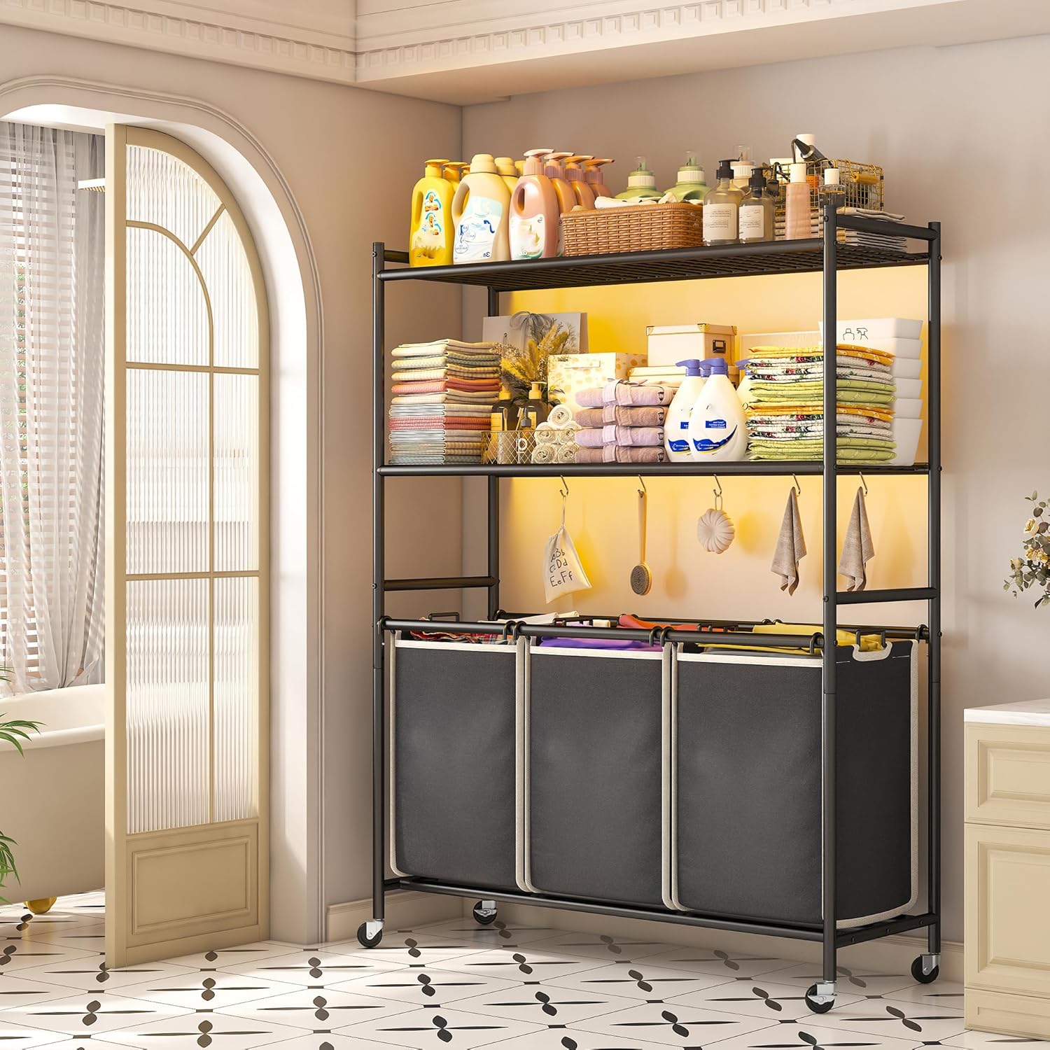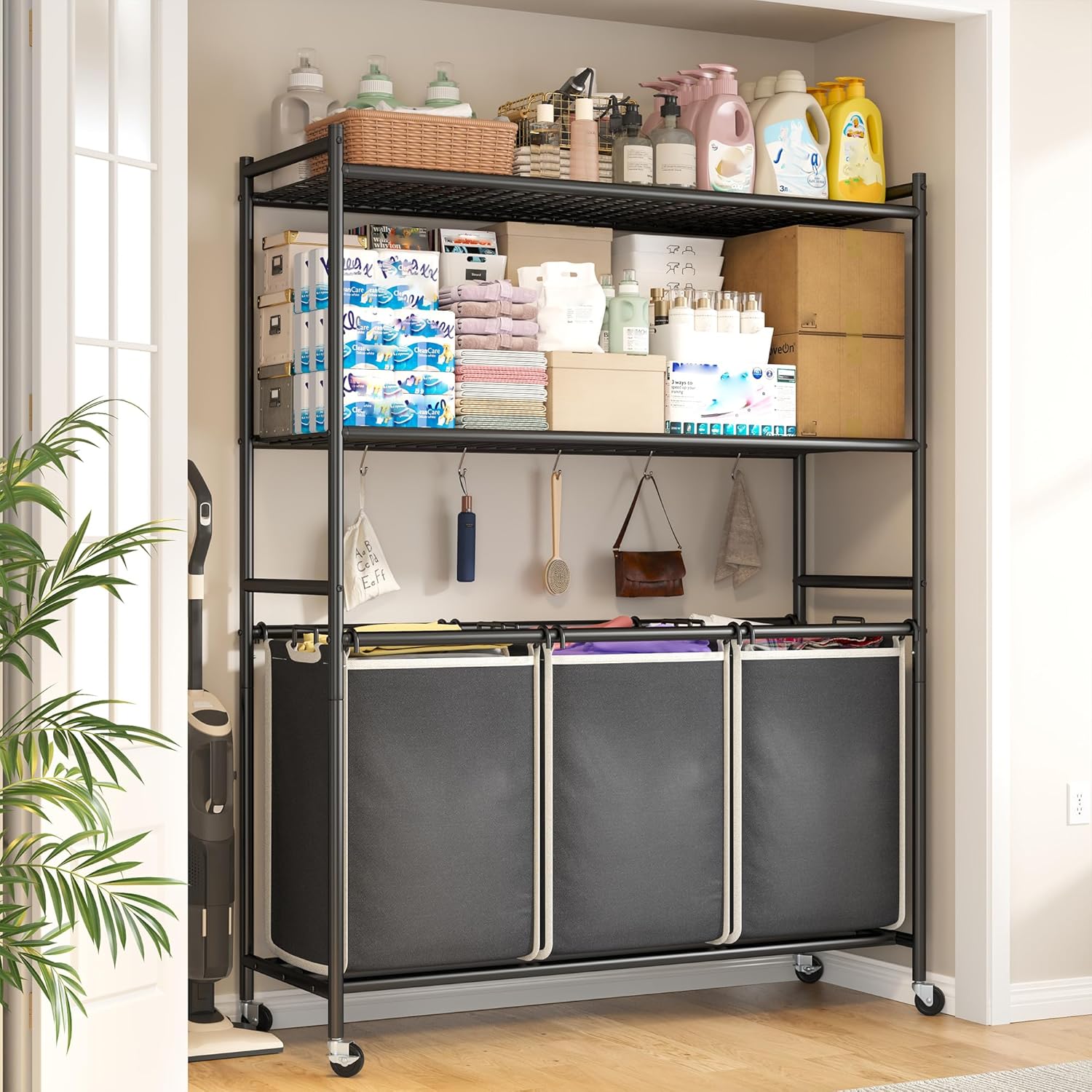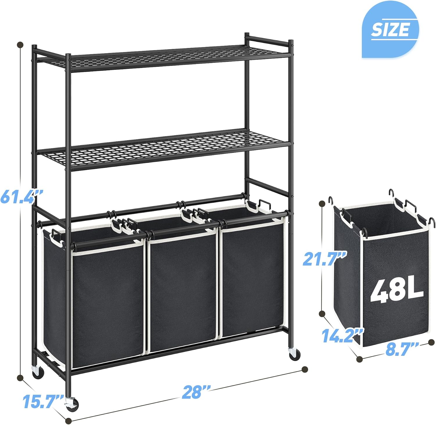 【Make Laundry Basket Organizer Easy with 3 Heavy Duty Hampers】This laundry sorter with shelves is features 3 roomy and stiff bags that can sort loads of clothes awaiting wash day, each laundry bag can hold up to 30 lbs. With dual reinforced handles on each bag for easy lifting, you can effortlessly remove the bags to carry laundry to and from the laundry room, washing is no longer a puzzled chore