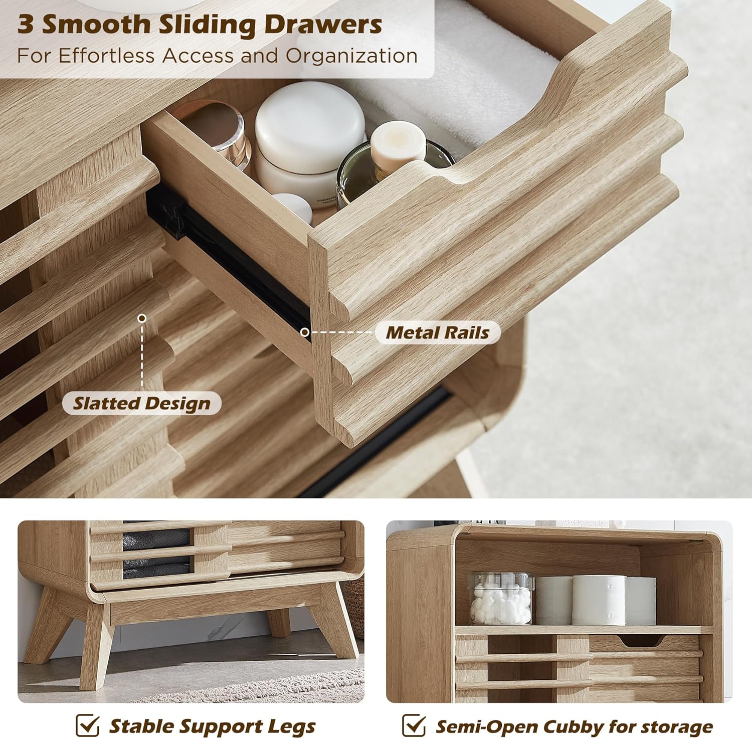 3 Smooth Sliding Drawers with Metal Rails