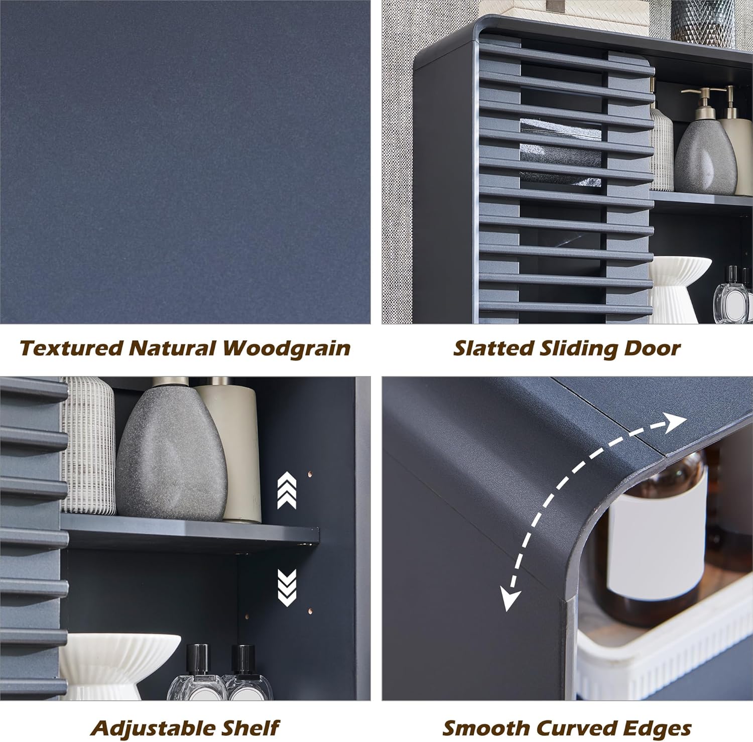 Slatted Sliding Door: The slatted sliding door provides easy access to your items while adding a touch of elegance to your bathroom storage