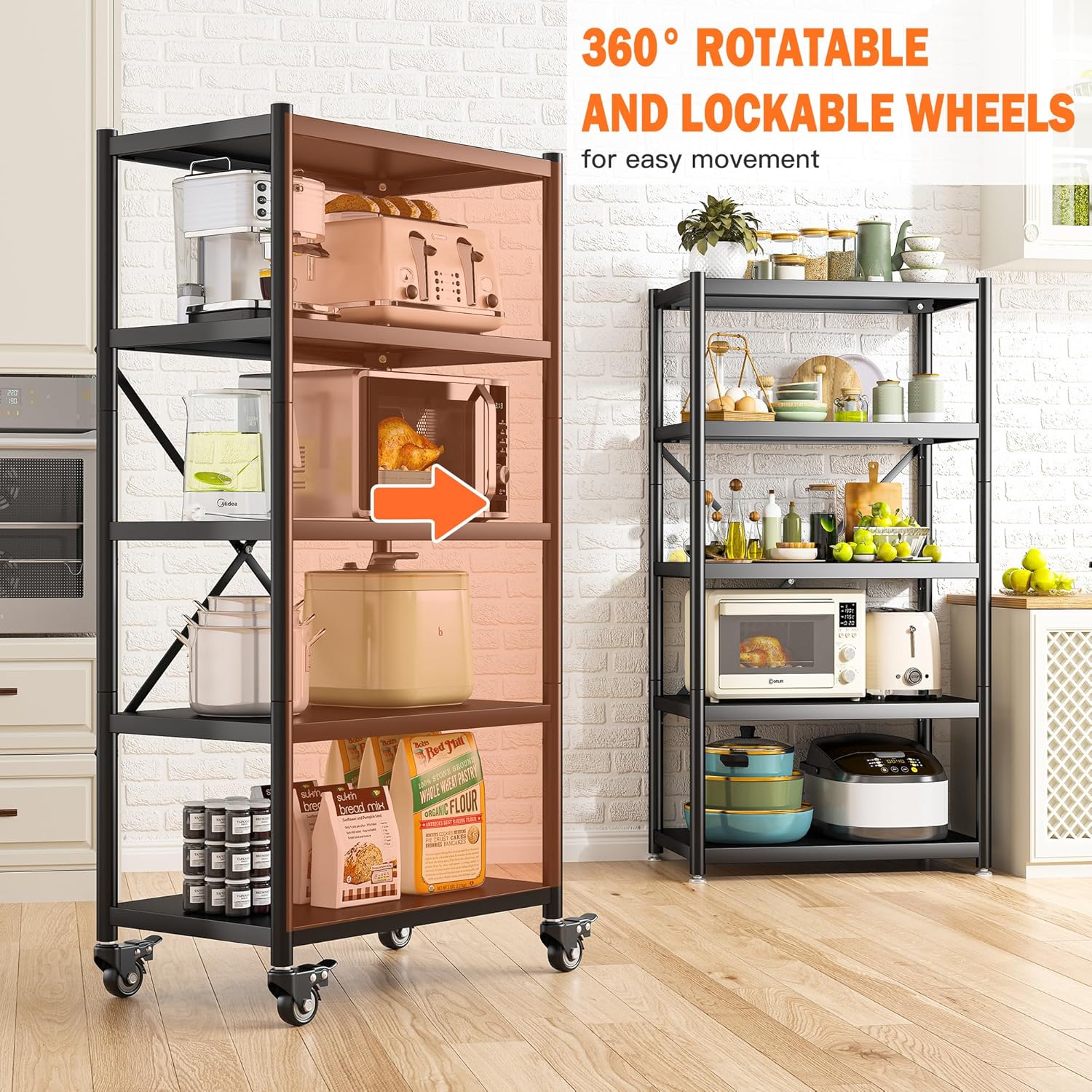 【Adjustable And Sturdy wheels】:The shelving unit equipped with 4 lockable wheels (360°rotation) and adjustable leveling feet create dual stabilization. Each heavy duty wheel features independent braking to prevent rolling, ensuring metal storage shelves remain firmly positioned even under heavy loads.