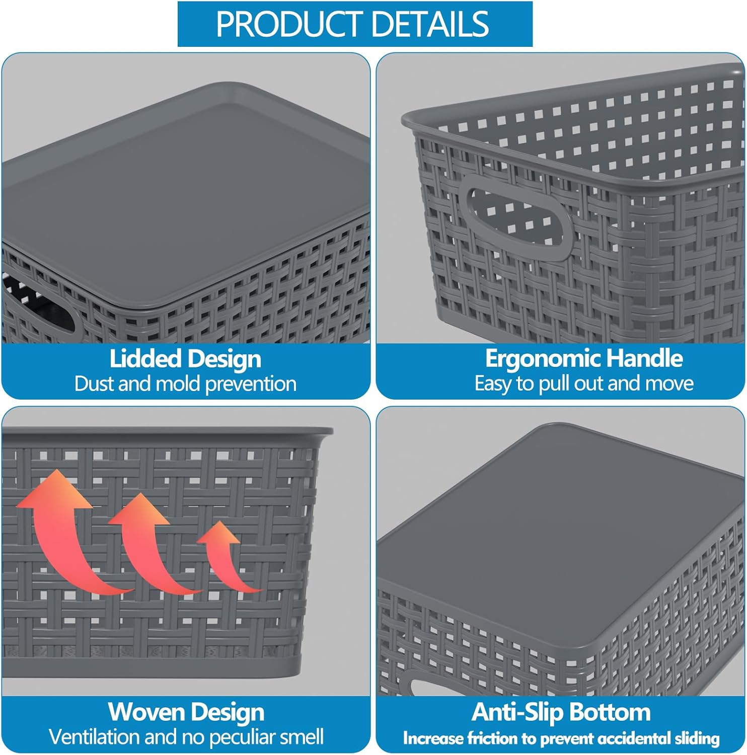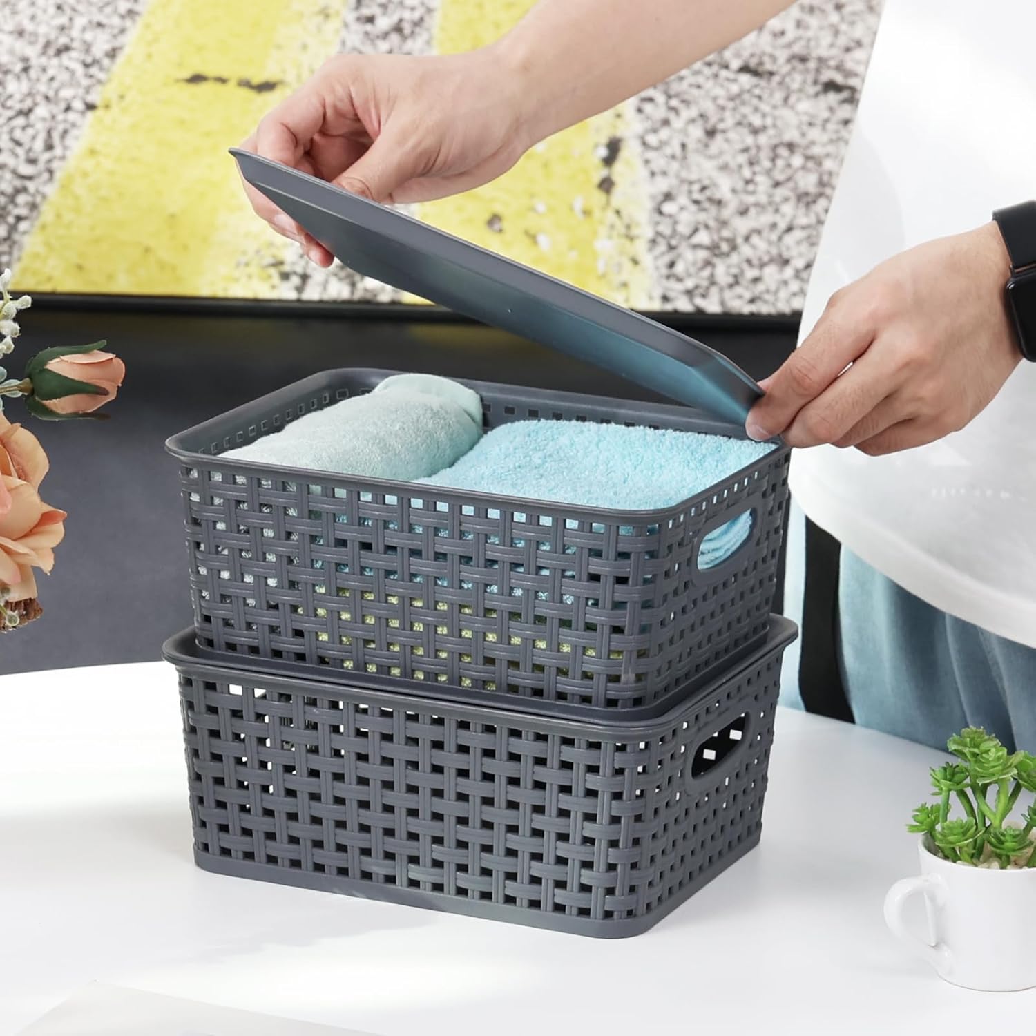 Stackable baskets with Lids can be stacked, which helps to organize items and save space