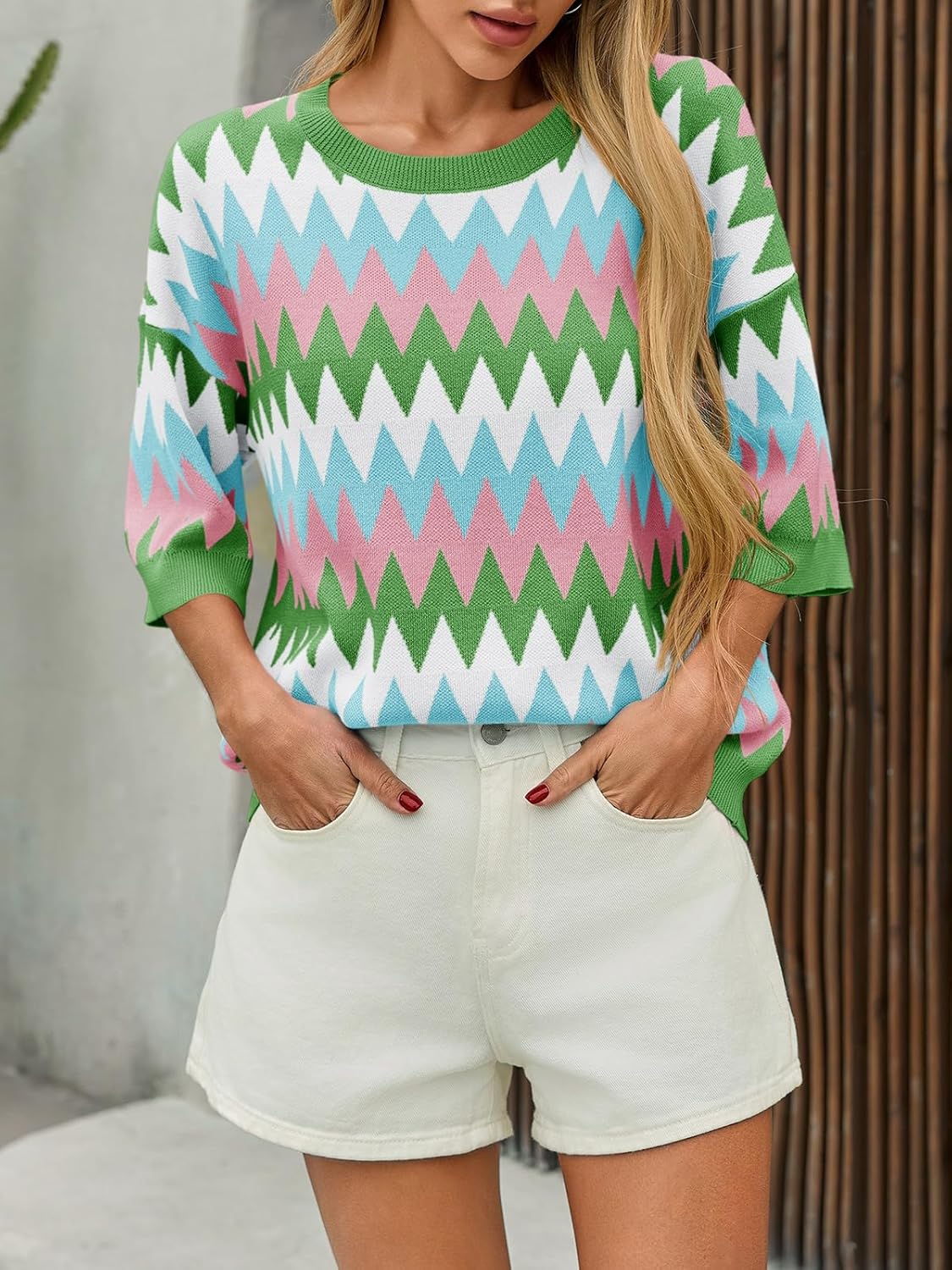 The colorful zig-zag pattern adds a chic style to this casual knit tops, perfect for summer and spring, suit for both teen girls and ladies.