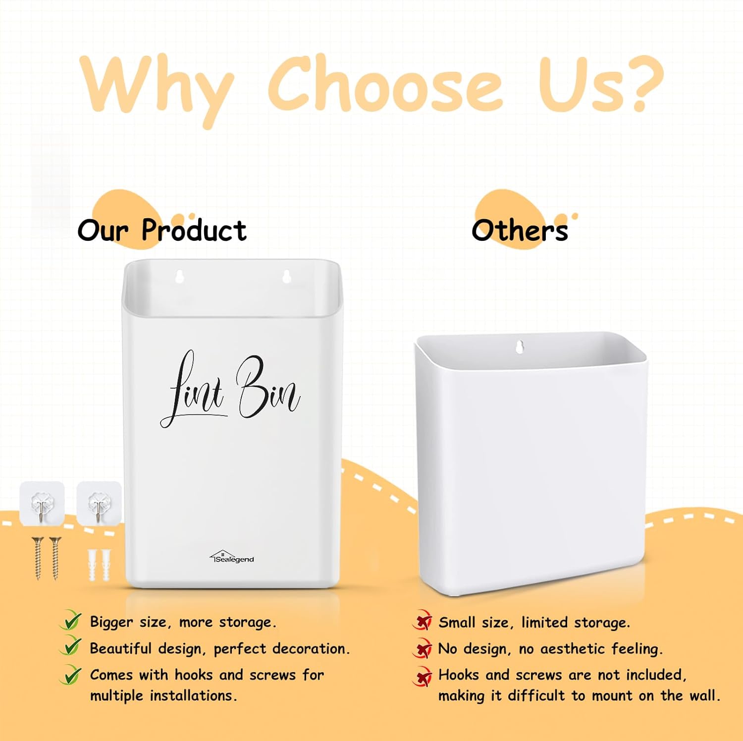 【Functional Versatility】 Sealegend lint bin can store lint, lost socks or other small items as a laundry room accessory to make your laundry room neater and less cluttered. Reusing lint is a great way to be environmentally friendly and is also great for storing small toys that kids like to play with in the room, such as blocks.