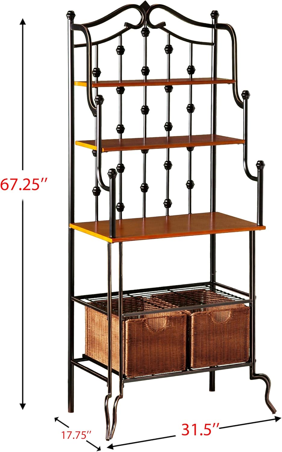 Elegant and beautiful, this unique black frame baker’s rack is a blend of form and function. Combining the large countertop workspace and upper shelves in a warm mission oak finish with two spacious rattan storage baskets, this kitchen organizer is sure to suit your needs. The decorative black with gold tipping frame and bottom shelf is crafted from iron tubing to ensure strength and durability. Dimensions include: Overall: 31.5″ W x 17.75″ D x 67.25″ HMission oak shelves: 26″ W x 6.5″ D (upper), 26″ W x 10″ D x 9″ H (lower); Counter: 27.75″ W x 15″ D x 12.75″/31″ H (to shelf/to floor); Wire shelf: 22.75″ W x 14.25″ D x 11.25″ H; Baskets: 10″ W x 13.75″ D x 9″ H; Clearance: 23″ W x 12.25″ D x 8″ H. This one-of-a-kind item approximately weighs 44 poundsApprox. weight: 44 lb.and can Supports up to: 20 lb. (each shelf), 10 lb. (each basket). Only quality materials and manufacturing will do. Product materials include: Materials: powder-coated round iron tube, rattan, MDF, veneer. Assembly: Required. Made in China.
