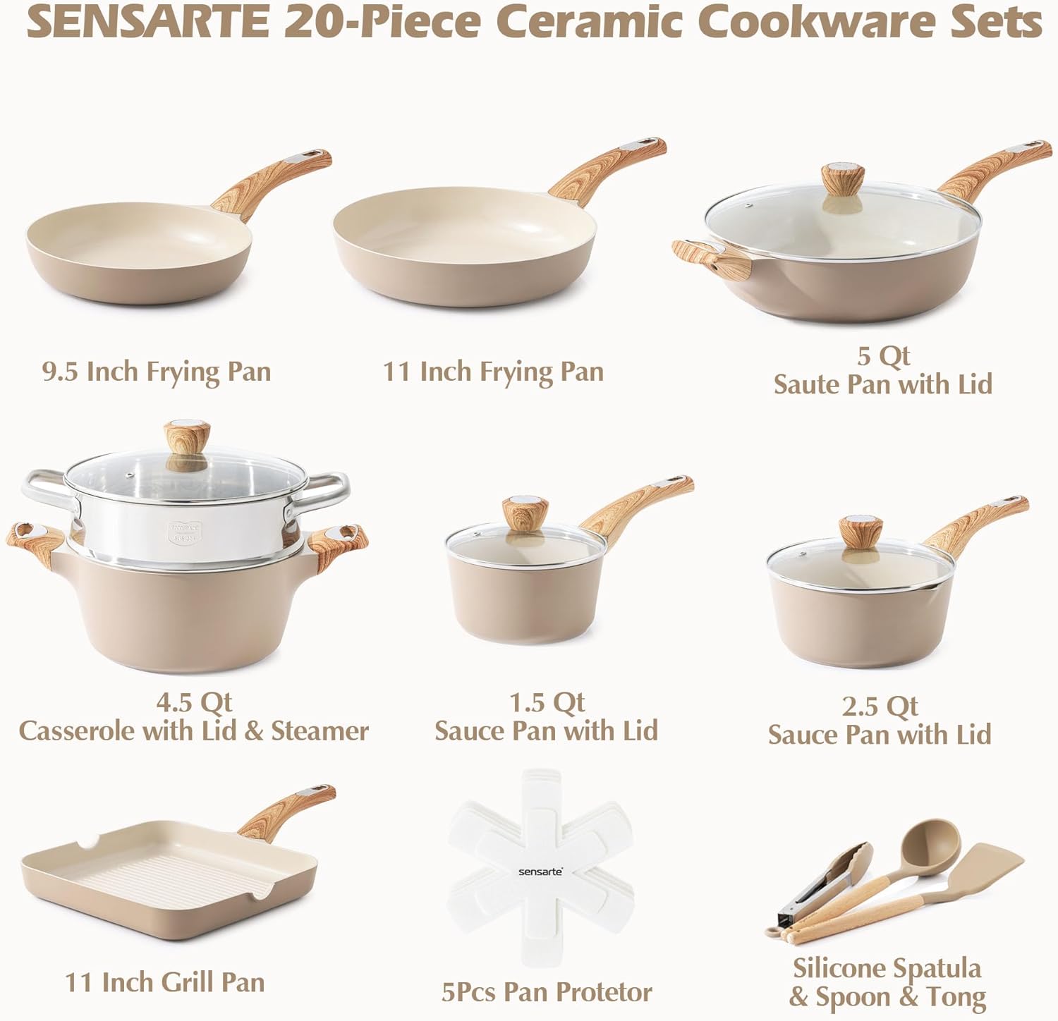 20-Piece Pots and Pans Set Includes – 9.5 & 11 inch frying pan set, 5Qt saute pan with lid, 4.5Qt casserole with lid & steamer, 1.5Qt & 2.5Qt saucepan with lid, 11 inch grill pan, Silicone spatula & spoon & tong, 5pcs pot protectors.
