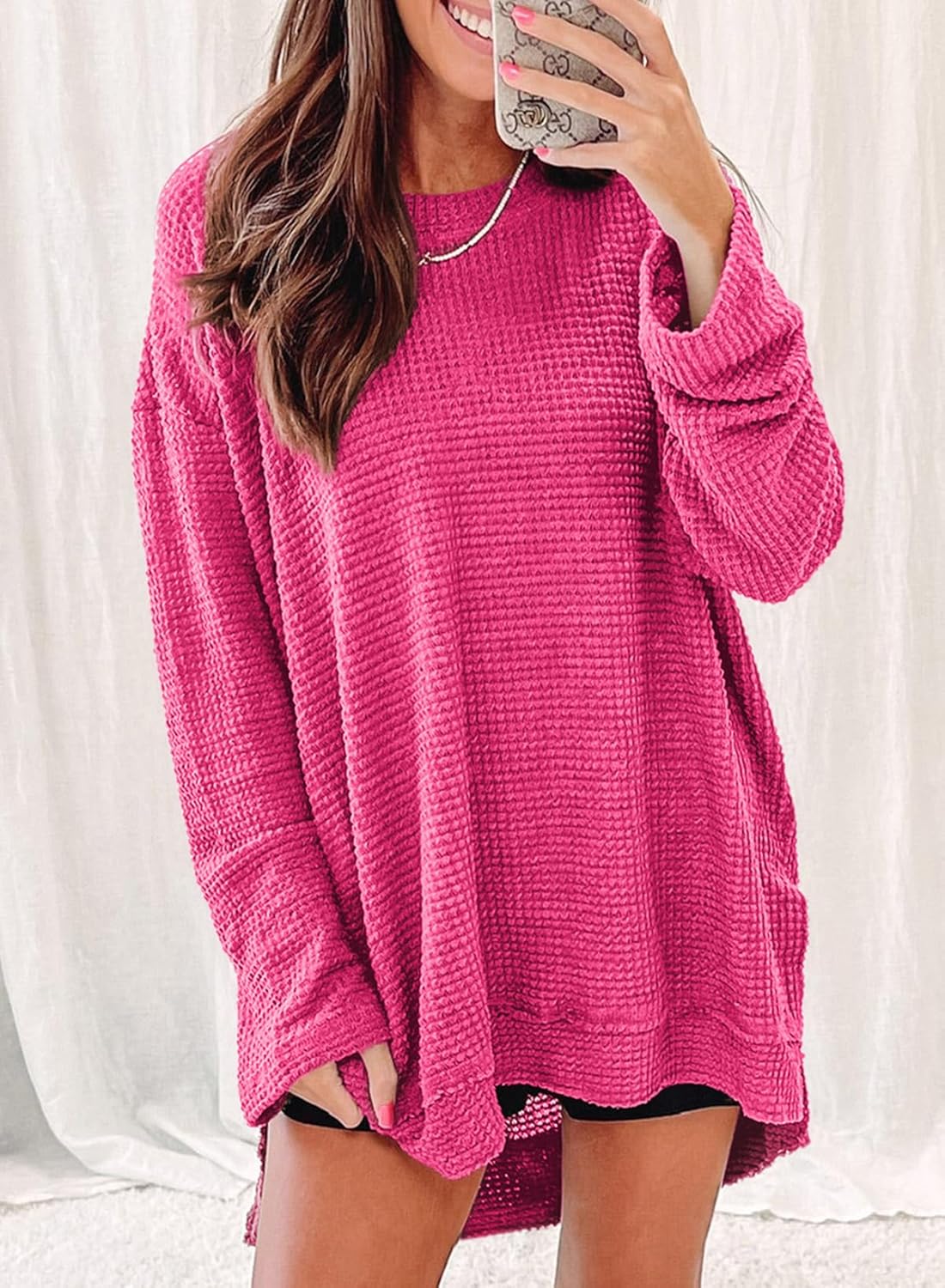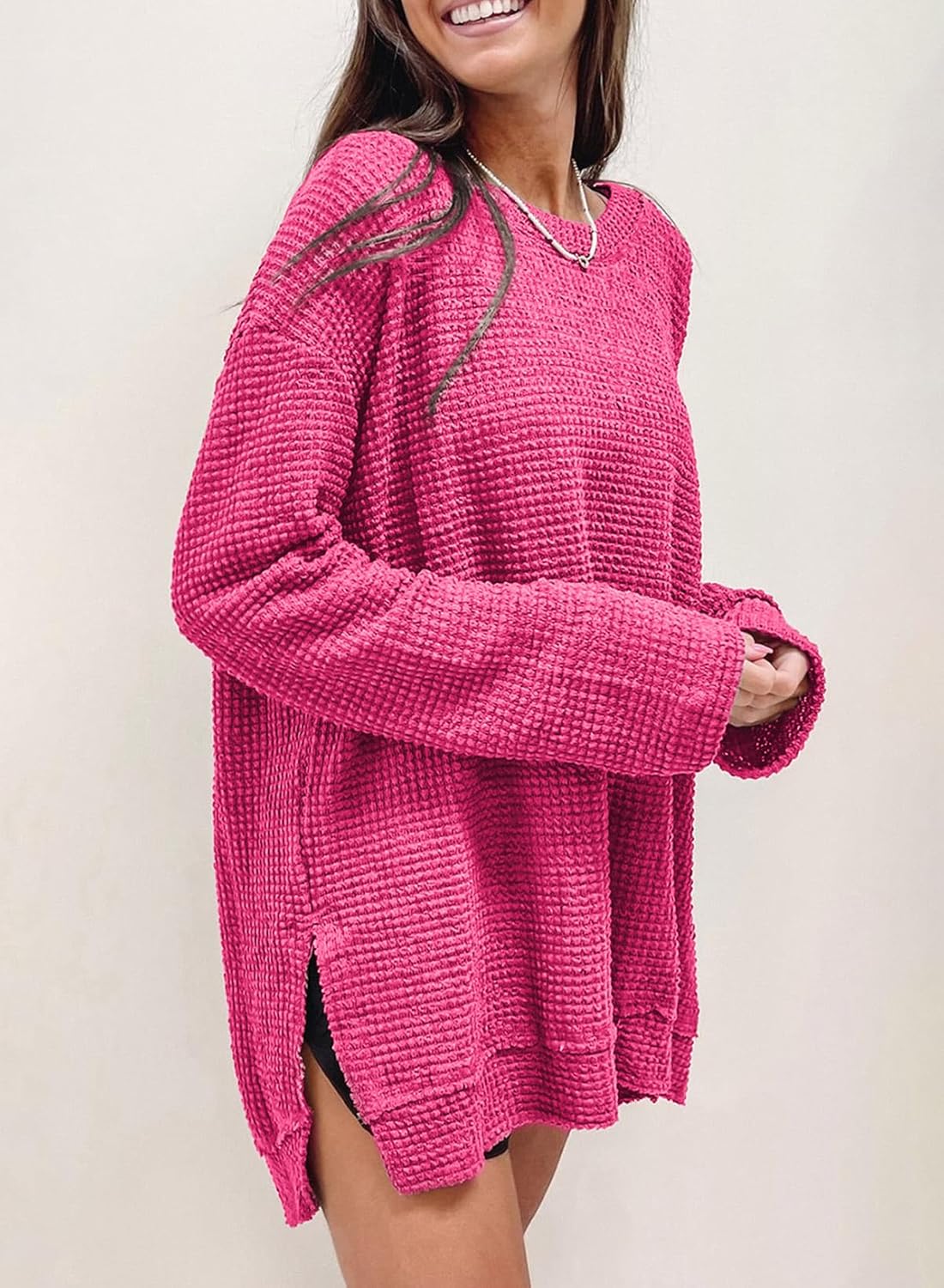 SHEWIN Long Sleeve Shirts For Women Oversized Sweatshirt Crewneck Waffle Knit Spring Tops for Women 2025