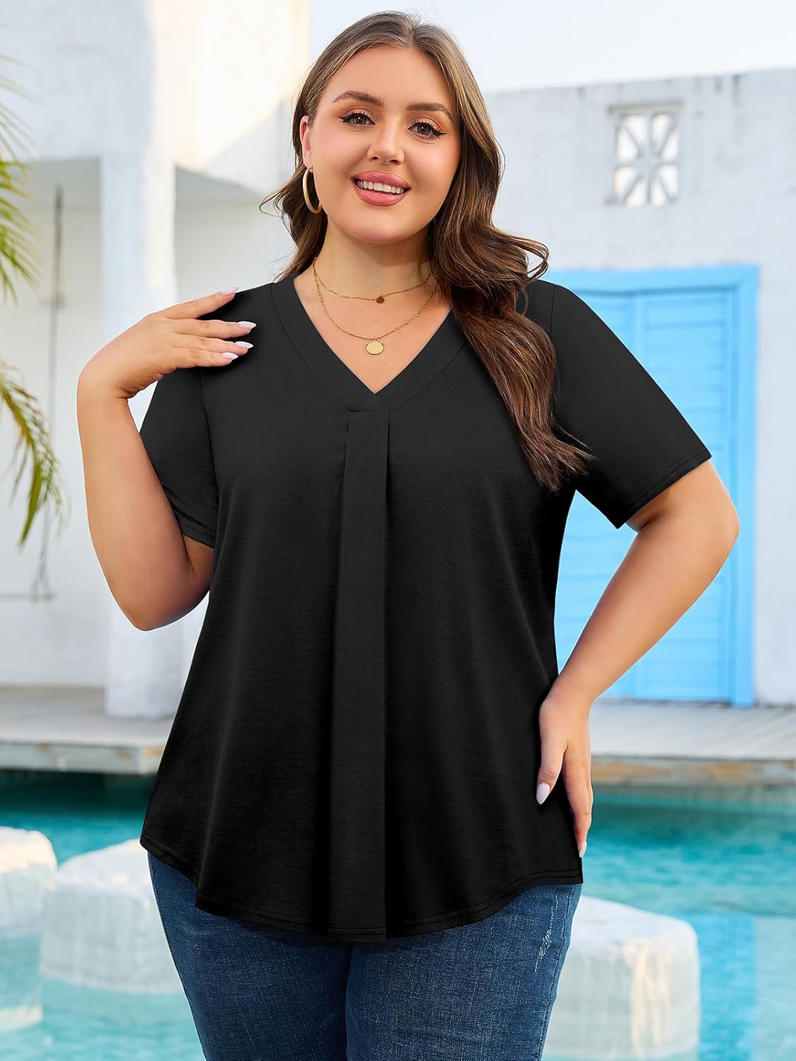 Plus Size Pleated V Neck T-shirt Dressy Casual Babydoll Blouses plus size summer tunic tops for women 2025plus size summer tunic tops for women 2025