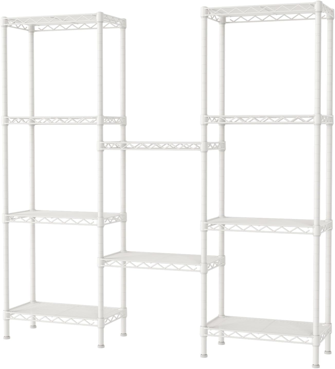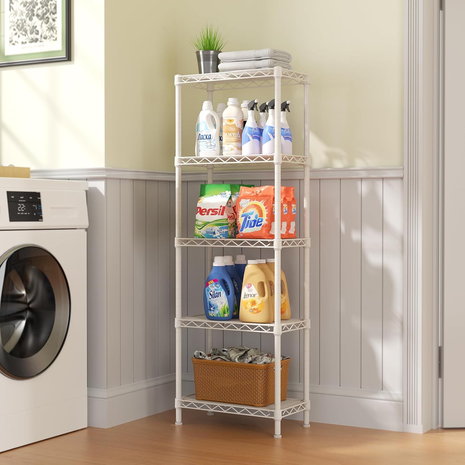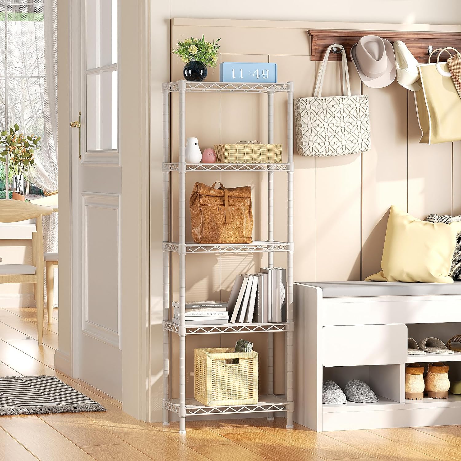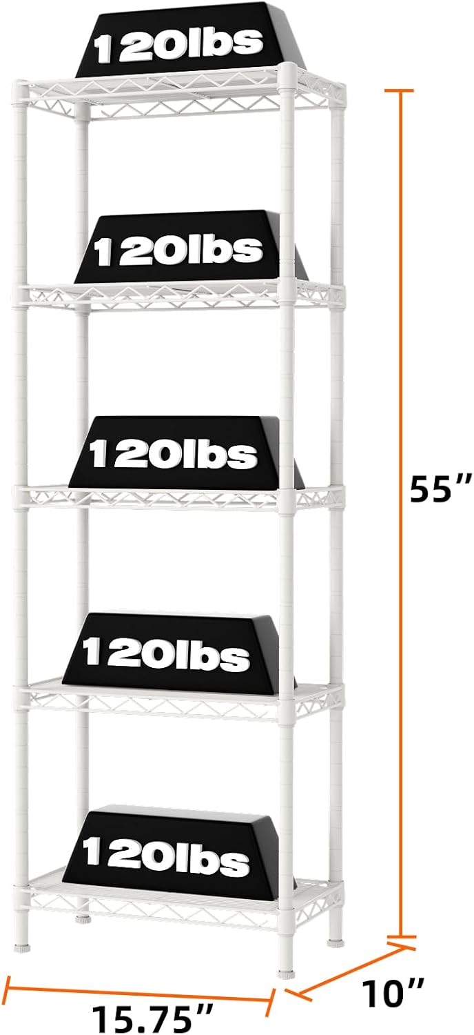 Convenient Home Storage: Metal wire shelves with adjustable spacing (10″ D x 16″ W x 55”H) make perfect for narrow spaces or room corners such as kitchens, bathrooms, laundry rooms, balconies, garages, entries, or offices.