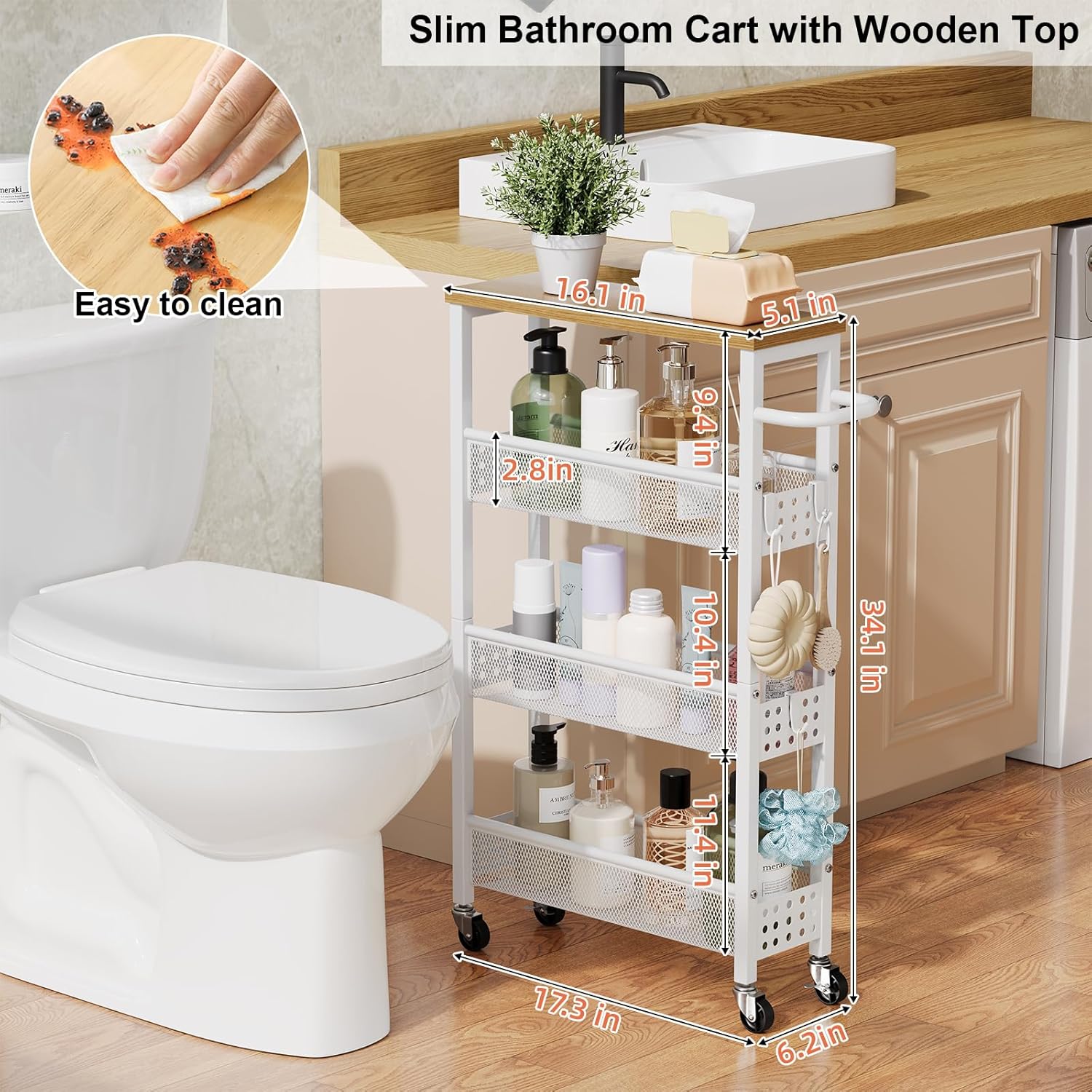 【Large Storage Capacity】4-tier slim storage cart with wheels trolley features three mesh baskets and a wooden top, offering ample space to store all your essentials. It is ideal for organizing kitchen spices, cans, bathroom and laundry supplies, or even office necessities.