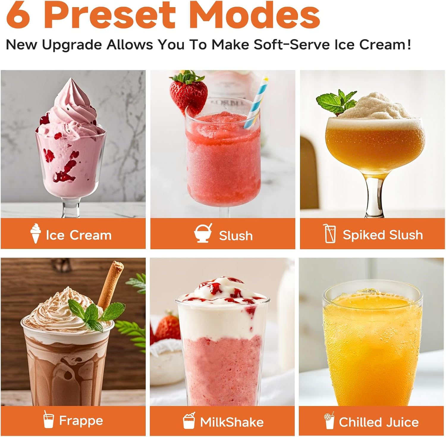 6 PRE-SET MODES: New upgrade allows you to make soft serve ice cream! With 6 pre-set modes, Choose from slush, ice cream, frappé, milkshake, and more—all at the touch of a button. Each mode is optimized for the perfect texture and temperature, ensuring delicious results tailored to your preferences.