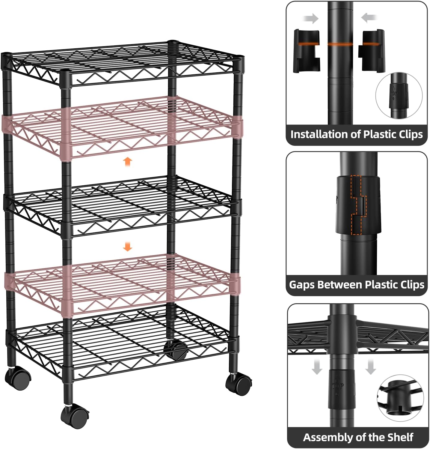 DIY: Adjustable shelf height to meet the needs of different sizes of items stored, equipped with feet for better balance and stability, also equipped with 4 wheels for mobility, also equipped with pp spacers for storing small items.