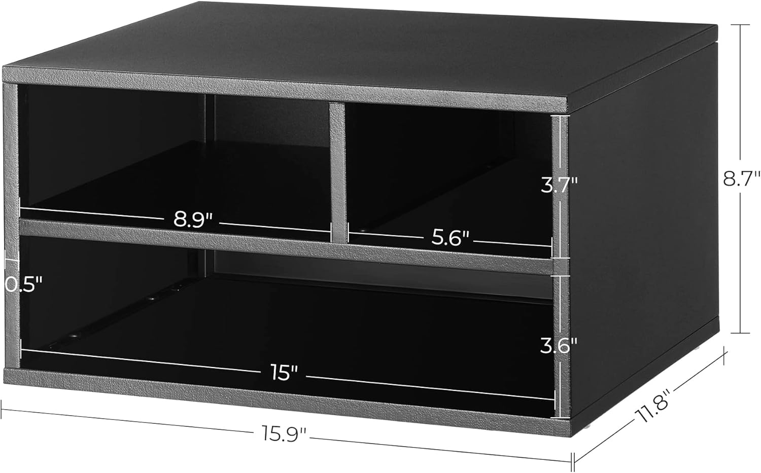 Color: Matte BlackMaterial: SteelProduct Size: 11.8”D x 15.9”W x 8.7”H (30 x 40.5 x 22 cm)Product Weight: 6.6 lb (3 kg)Max. Static Load Capacity of the Top Shelf: 110 lb (50 kg)Max. Static Load Capacity of the Middle Shelf: 33 lb (15 kg)