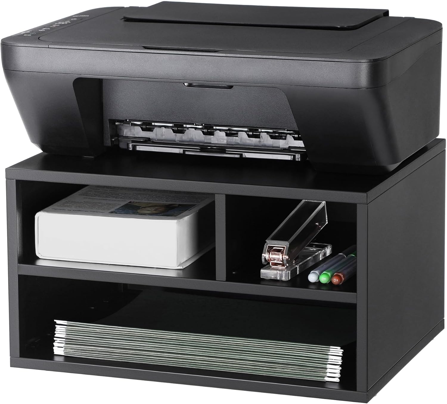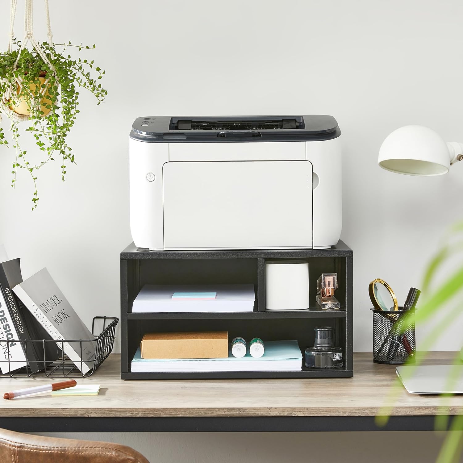 [Optimize Printer Storage] Does your printer occupy half of your desk surface? Are your reams of paper piled with your books? Let this small printer stand help! It gives your printer a dedicated spot while keeping your office supplies tidy